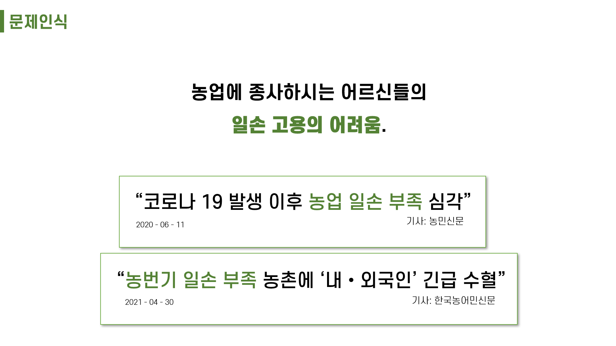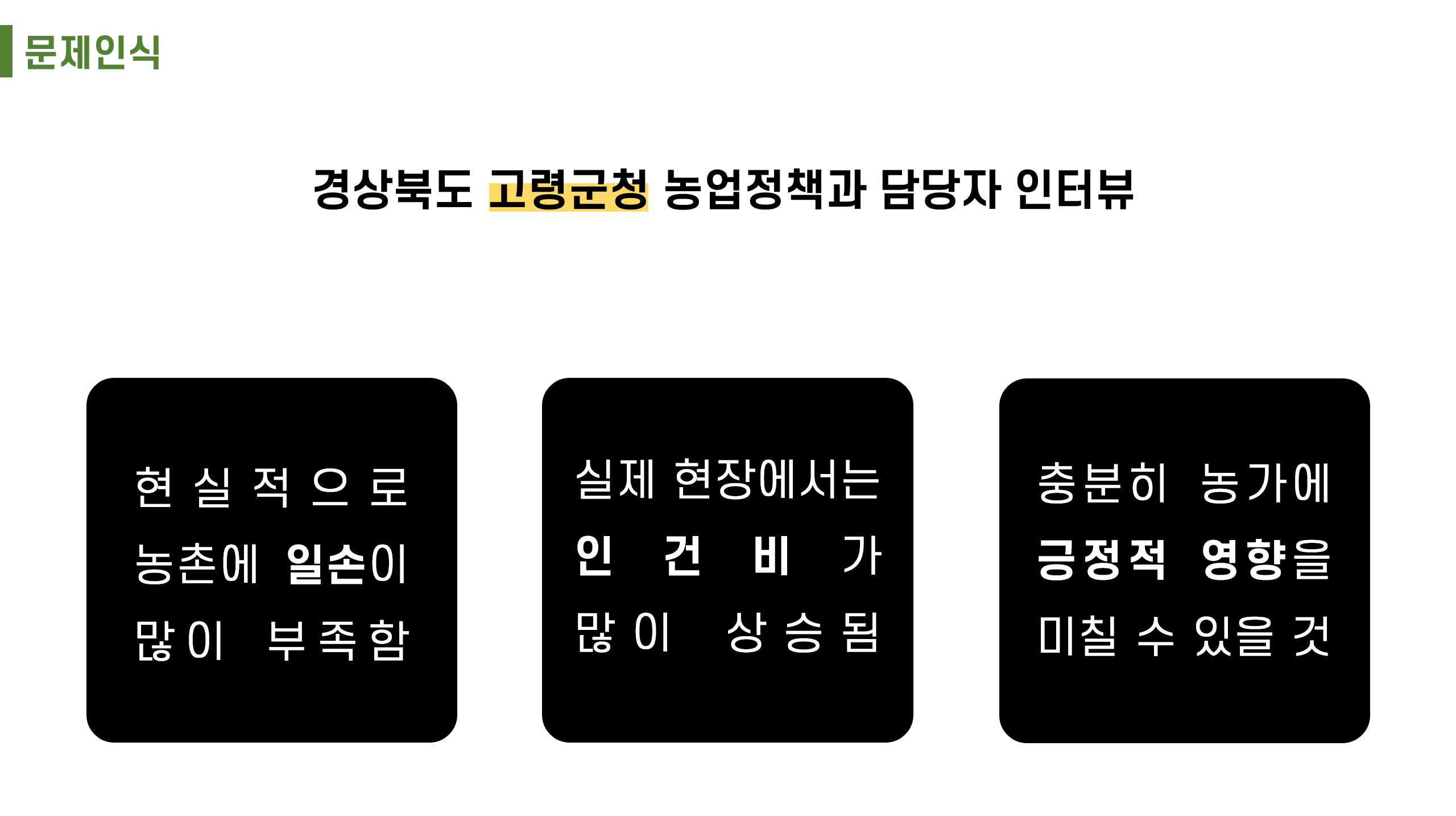 이 문제점들을 검증하기 위해 경상북도 고령군청 농업정책과 담당자와 인터뷰를 진행하였고, '현실적으로 농촌에 일손이 많이 부족하다', '실제 현장에서는 인건비가 많이 상승되었다', '그리하여 우리 서비스가 출시된다면 충분히 농가에 긍정적인 영향을 미칠 수 있을 것이다'라는 응답을 얻었다.