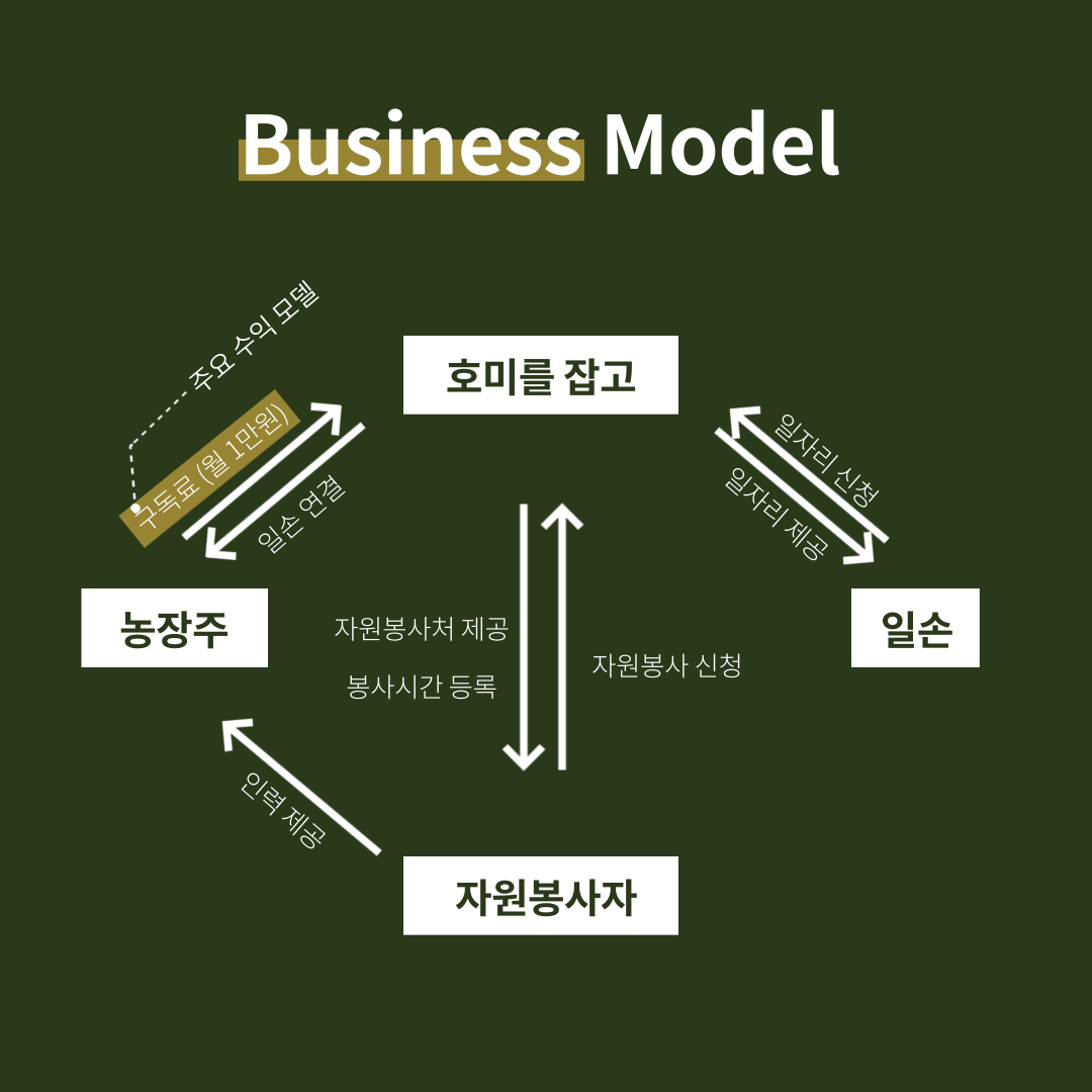비즈니스 모델과 수익 모델 또한 구상했다. 거래가 성사될 때마다 농장주에게 일정 수수료를 부과하는 것은 '편리하고 간결한 서비스 디자인'을 추구하는 가치관에 맞지 않아서, 농장주에게 '월정액 1만원' 과금을 요청하는 수익 모델을 구상해냈다. 1만원이라면 농장주에게 그렇게 부담이 많이 가지 않을 것 같아서 위와 같이 수익 모델을 정했다.