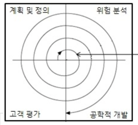 위 사진과 같이, 나선형 모델은 계획 → 위험 분석 → 구현 및 테스트 → 고객 평가의 순서로 이루어진다.