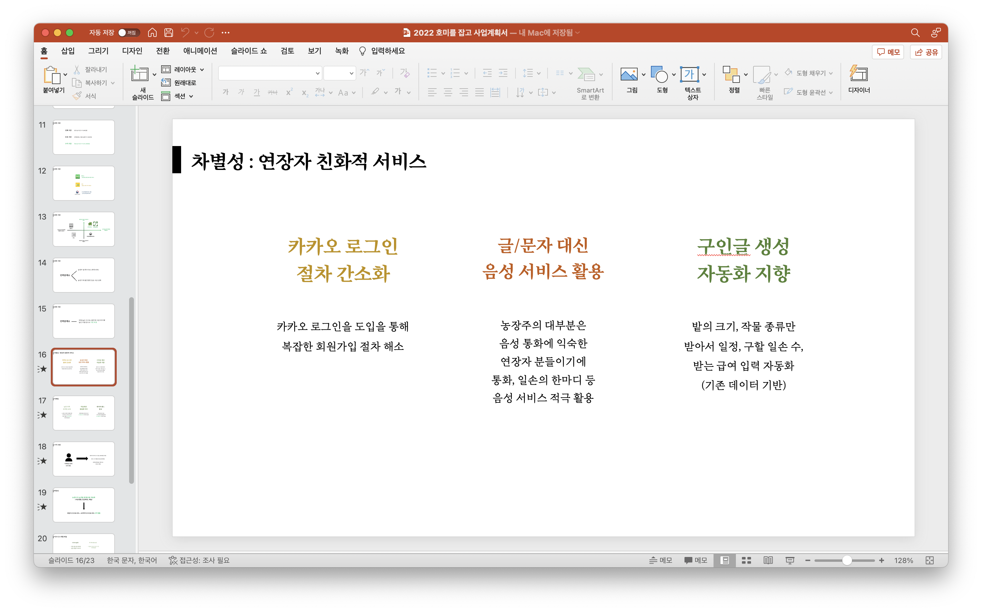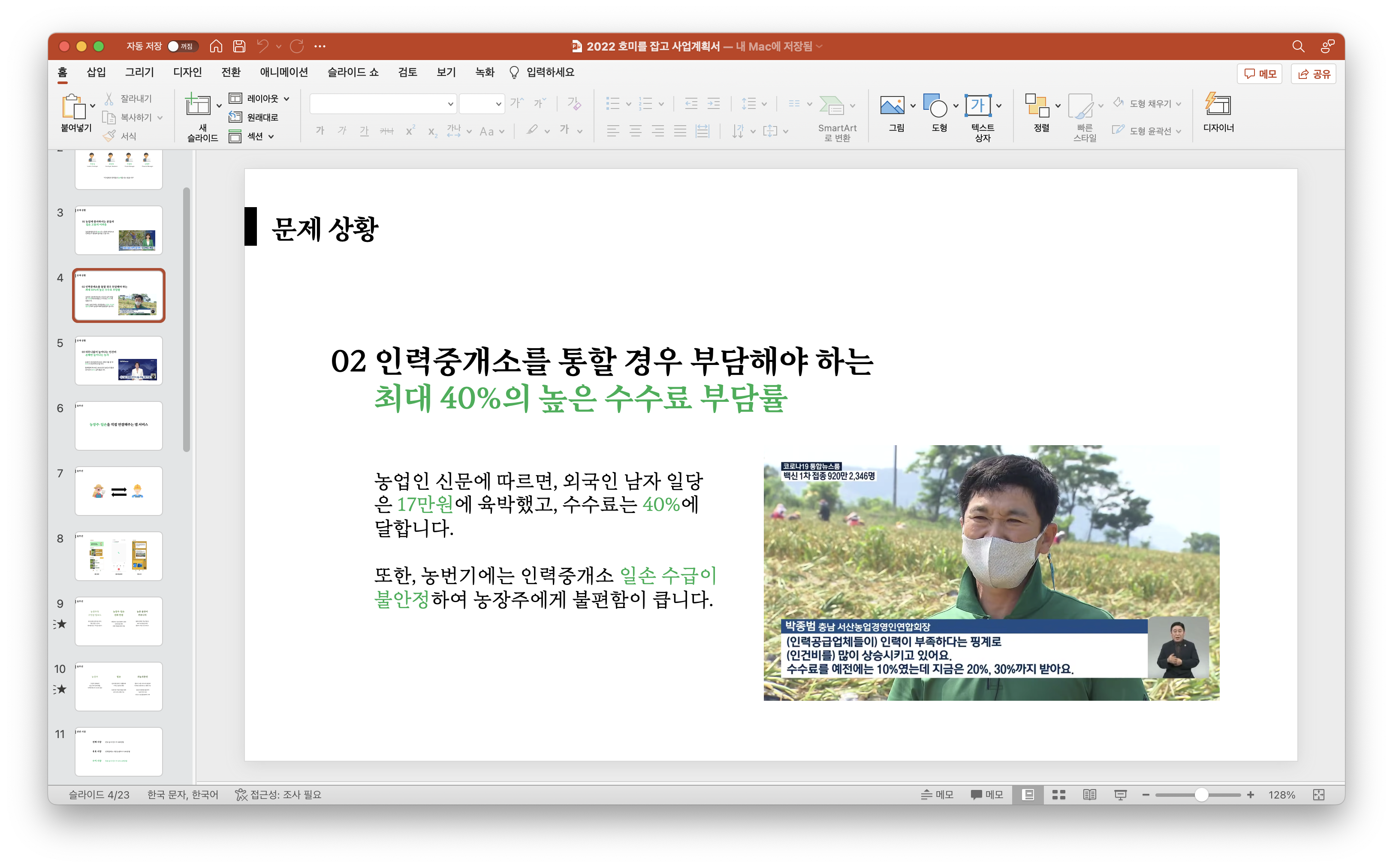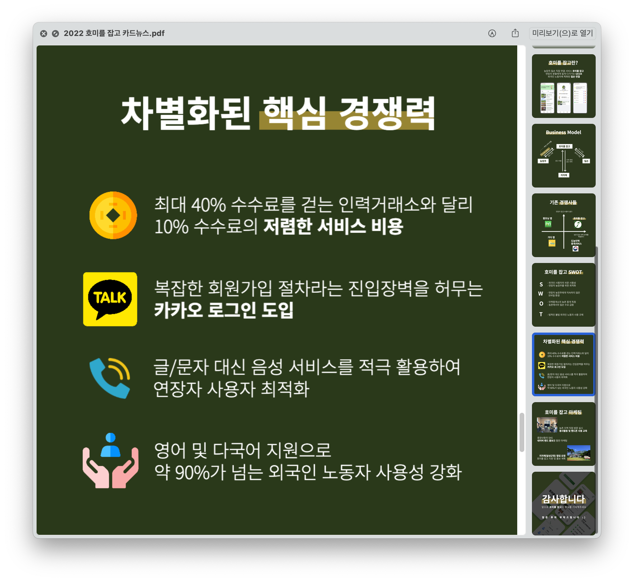 또한 피칭 부문 준비를 위해 사업보고서(발표 자료)를 다시 만들며, 이 과정에서도 멘토링을 통해 많은 피드백을 수용했다. 발표 자료를 준비하면서 가장 중점적으로 생각한 것은 '2년동안의 집착과 현장 답사를 통한 아이디어 변화'이었다. 특히 현장 답사에서 들은 실제 고객의 피드백을 수용하면서 우리 아이디어가 훨씬 더 성숙해졌다는 생각을, 내가 확신하는 우리 아이디어에 대한 미래를 그대로 전하고 싶었다. 팀원들의 도움을 받으며 바쁜 일정에도 2021~2022 '호미를 잡고' 아이템의 변화 과정을 잘 설명해주는 발표 자료를 성공적으로 준비했고, 원격 회의를 통한 피칭(발표) 또한 성공적으로 진행하면서 피칭 부문 본선 진출이라는 소식을 받았다.