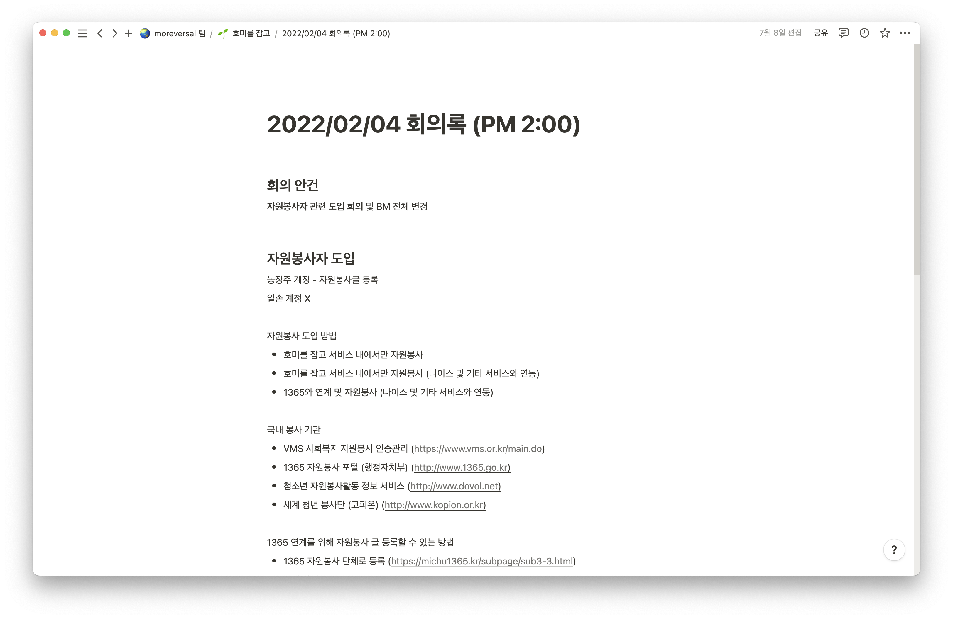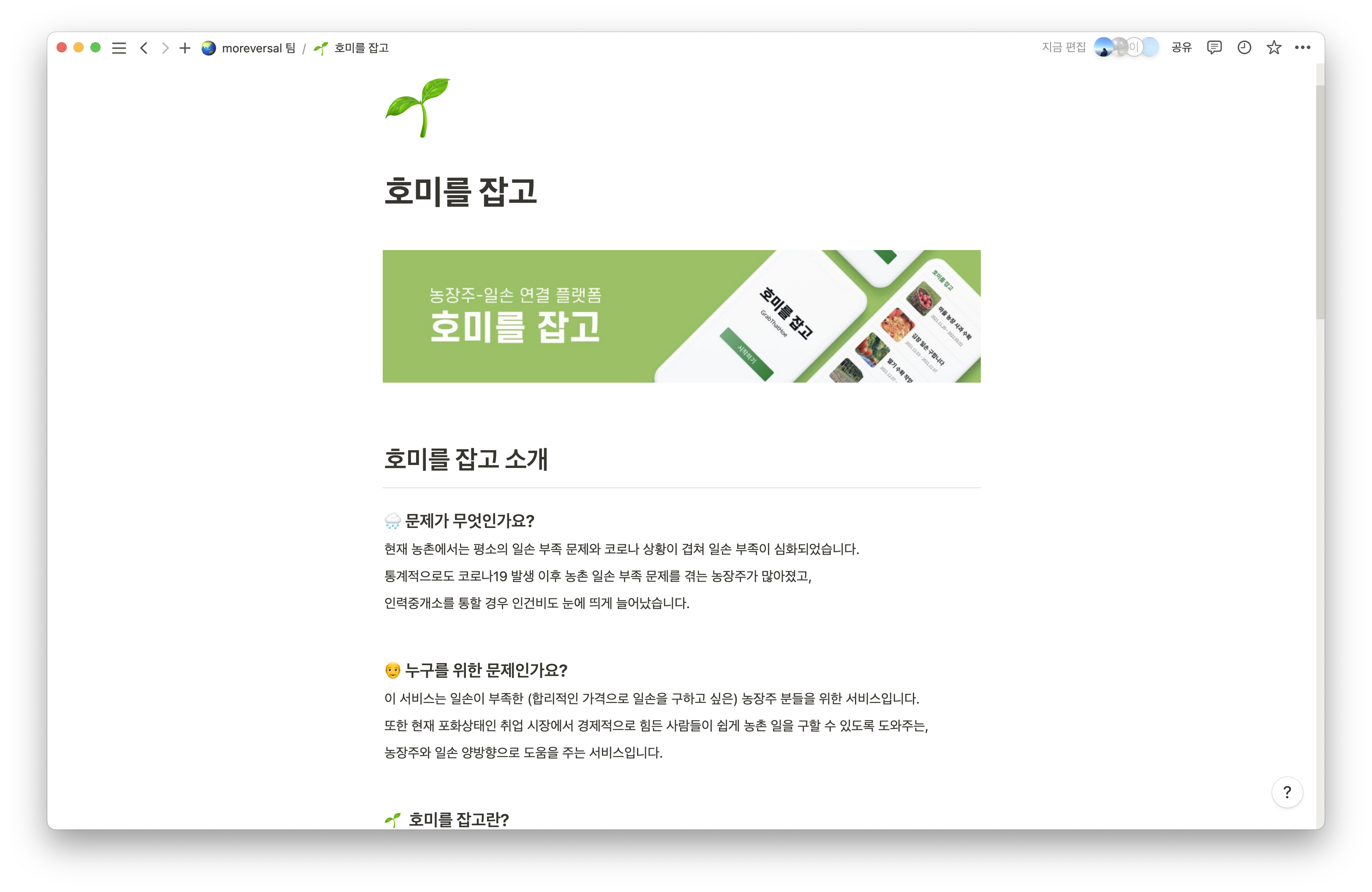 먼저 2021년 창업놀이터 페스티벌이 마무리되고 며칠 후에, 우리 moreversal(모어버설) 팀은 호미를 잡고라는 프로덕트 및 팀웍을 발전시키기 위해 노션(Notion) 팀 사이트를 만들었다. 팀 페이지 안에서 팀에 대한 정보 및 회의록, 기타 자료를 관리하기 위해 초반 작업들을 해나갔다. 현재에도 꾸준히 노션을 이용해 API 리스팅, 회의록 정리 등을 수행하고 있으며 현재 웹에서 https://moreversal.com/ 이 주소를 통해 볼 수 있게 도메인을 연결했다.