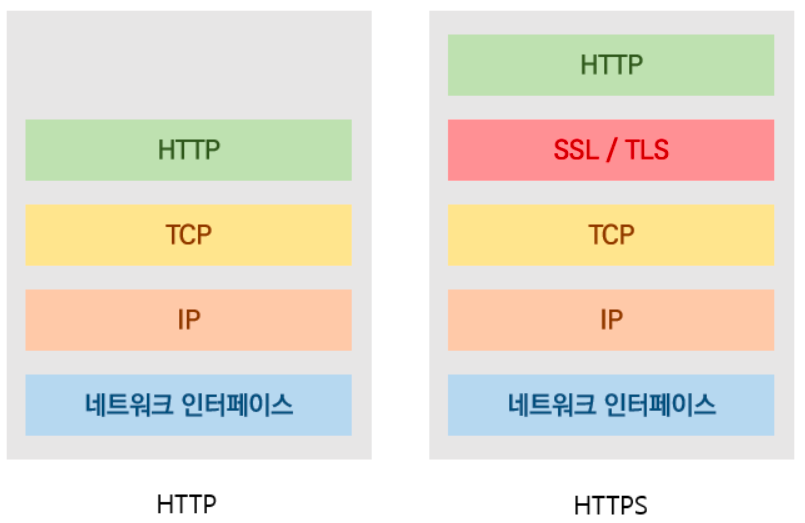 기존의 HTTP는 TCP/IP 위의 애플리케이션 계층에서 사용되는 프로토콜이다. HTTPS는 TCP/IP 계층 위에 SSL(TLS)를 얹어 보안을 강화한 프로토콜 방식이다. 이를 통해 모든 HTTP 요청과 응답은 암호화된다.