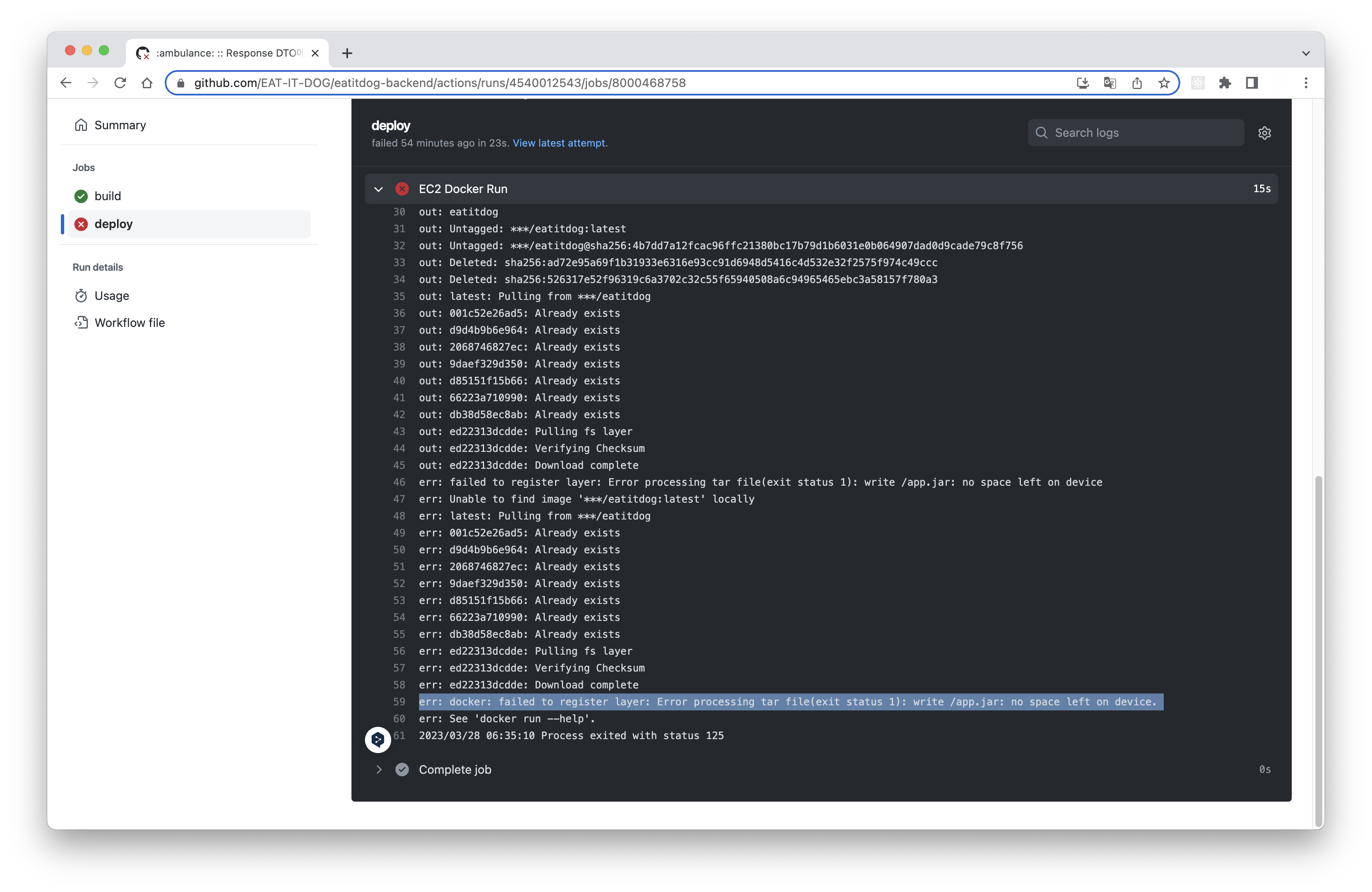 err: docker: failed to register layer: Error processing tar file(exit status 1): write /usr/local/openjdk-11/lib/server/classes.jsa: no space left on device.\