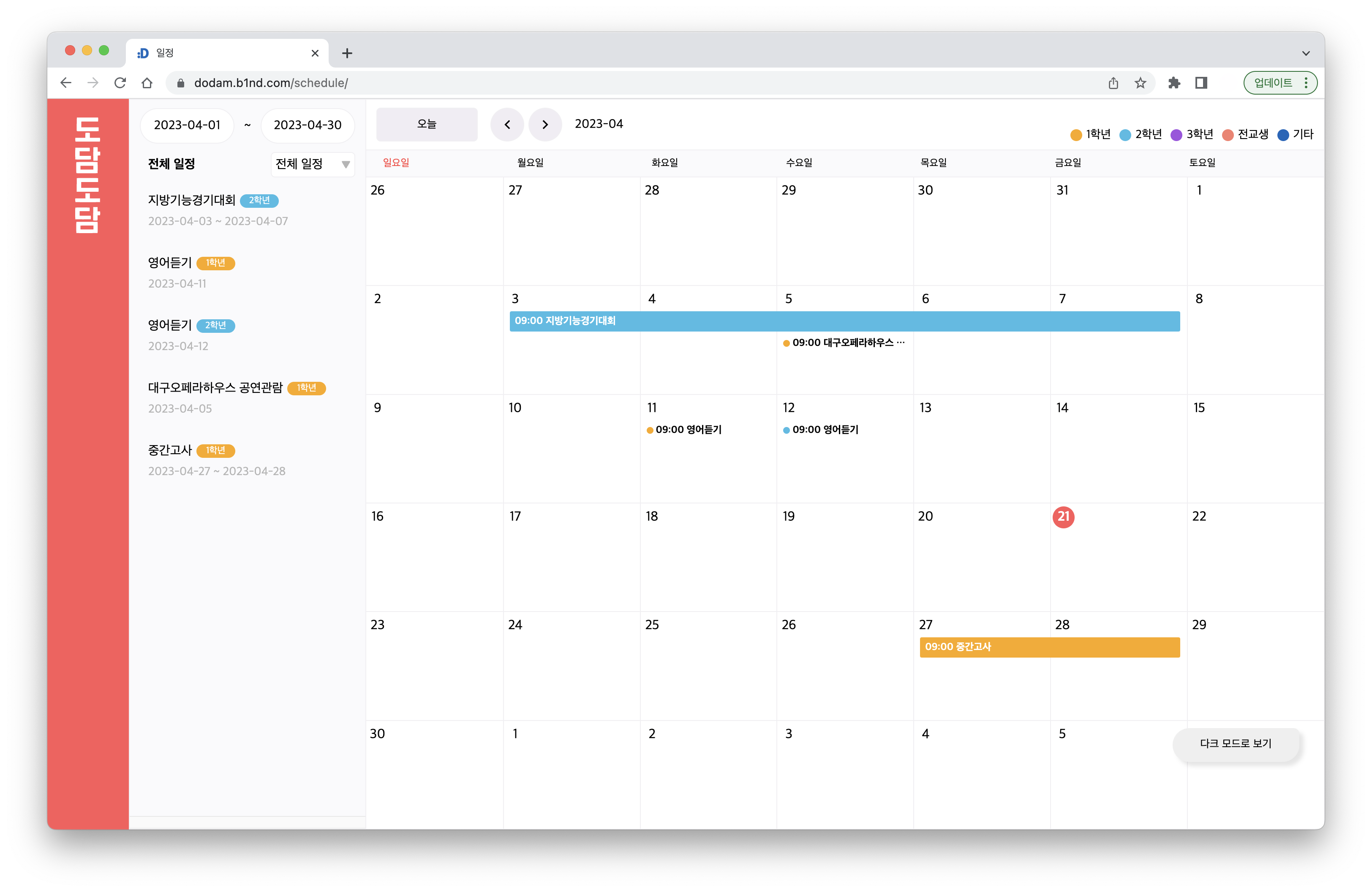 바인드 팀의 메인 프로덕트인 '도담도담'은 대구소프트웨어마이스터고의 외출/외박, 자습실 신청, 상벌점 관리, 기상송 신청, 분실물 신청 등의 서비스를 제공하는 교내 스마트 스쿨 플랫폼이다. 나는 2021년 초반에 바인드 팀 4기 리더 이영은 선배님의 도담도담 설명회를 듣고, 바인드 팀의 문화 및 프로덕트에 반해버렸다. 그때부터 바인드 팀 백엔드 개발자이셨던 신중빈 선배님께 백엔드에 대한 지식을 여쭤보며, 개발에 대한 열정을 뿜뿜 했다. (내가 백엔드에 관심을 가지던 이유에 대해서는 이 글을 참고하기를 바란다.)