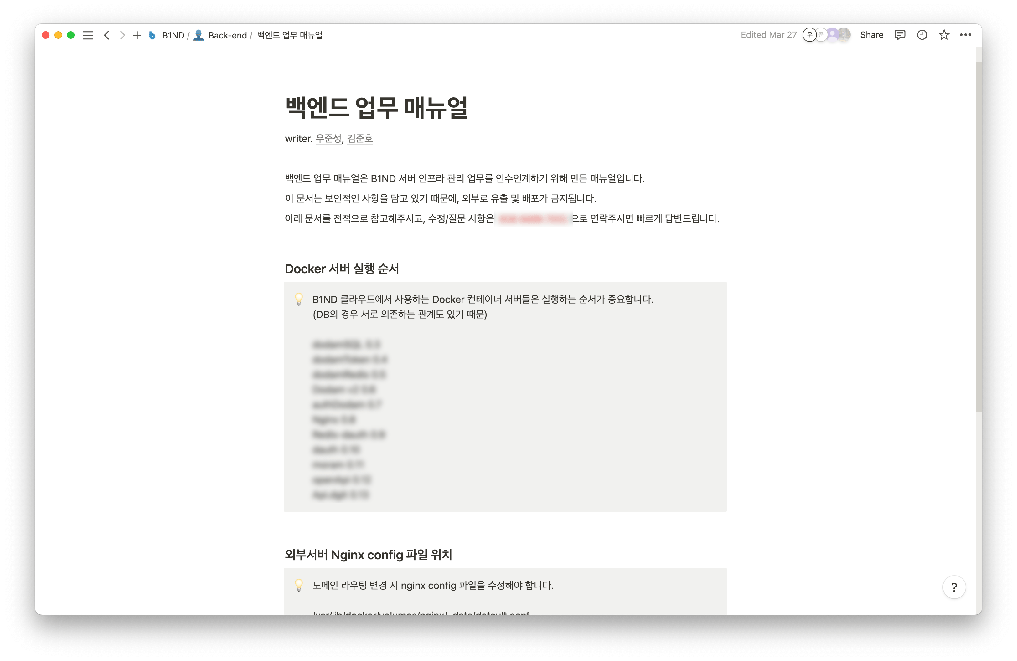 2022년 12월부터 인수인계 활동을 시작했다. 2023년부터는 바인드 7기 친구들이 주도권을 갖고 바인드 동아리를 운영해야 하기에, 개발 및 문화 측면에 있어서 인수인계가 필요하다. 백엔드 팀에서는 이지민 후배와 최수원 후배가 도담도담 백엔드 코드 및 인프라에 대해 전수받았다. 인수인계라고 해서 크게 전수하는 건 없고, 네이버 클라우드 계정 및 도커 인프라 구조, 앞으로의 백엔드팀 방향성 등을 가르쳐줬다.