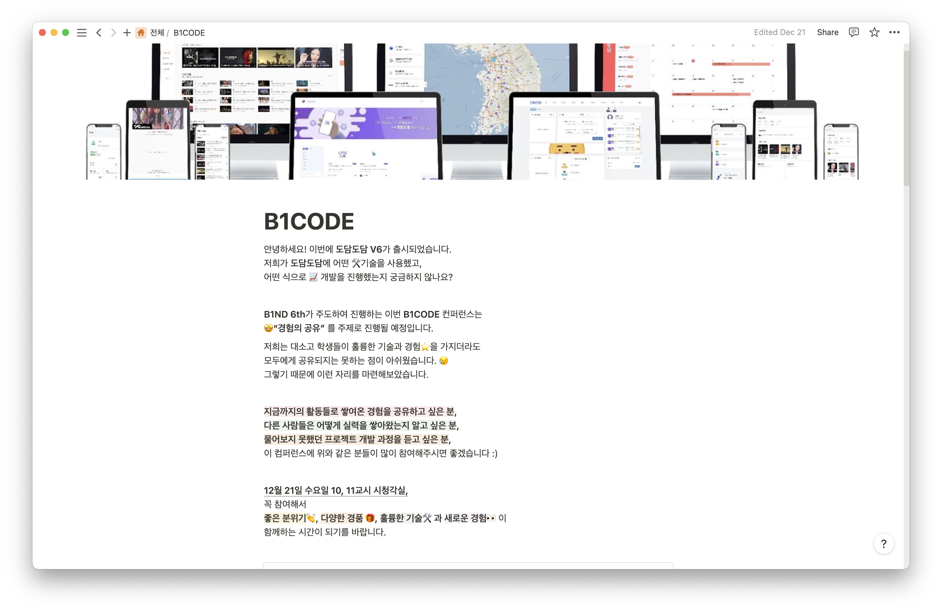 2022년 12월 21일, 바인드팀은 도담도담 V6에서 사용된 기술 및 지식을 전교생에게 공유하기 위해 컨퍼런스를 주최하고 진행했다. 사실 3년 전까지 대소고에서 매년 동아리들이 모여 이러한 컨퍼런스를 진행해왔지만, 코로나로 인해 진행이 멈췄다. 2022년에 코로나가 잠잠해졌음에도 컨퍼런스 관련해서 아무런 소식이 없어서, 팀 홍보도 할 겸 바인드팀이 본격적으로 진행하기로 했다. 바인드팀의 기술 공유가 중심이지만, 다른 팀 및 개인의 발표도 함께 진행했다. (컨퍼런스 이름인 B1CODE는 바코드라고 읽는데, 이는 '바인드의 소스코드'의 약어이다.)