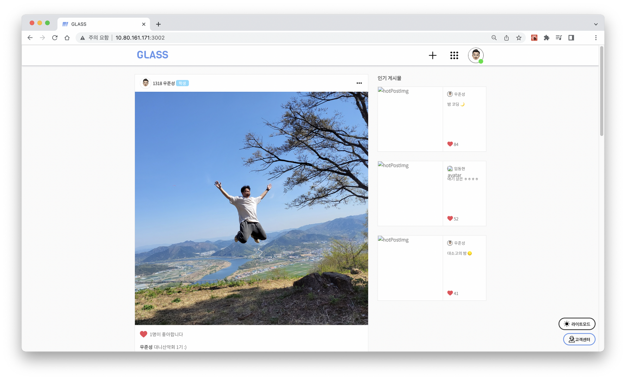 대구소프트웨어마이스터고등학교에서는 밴드 SNS 서비스를 통해 학부모-교직원-학생 간의 연결이 이루어지고 있었다. 아무래도 학부모, 교직원, 학생이 같은 그룹에 있다 보니 부담스러움 때문에 학생의 활동이 거의 없었다. 또한 공지사항, 건의사항, 기타 사진들을 구분하지 않고 게시해서 소통보다는 공지 위주의 SNS라는 느낌이 들었다. 이러한 문제점을 해결해 보고자 시작한 프로젝트가 'GLASS'이다. 글래스 서비스는 오로지 소통에만 초점을 맞춰 학생들의 일상을 투명하게 담아내는 서비스라는 비전을 토대로 하여, 학생-학부모-교직원 간의 활발한 소통을 도모한다. 학생들이 일상 사진을 공유하고, 학부모들과 교직원들이 댓글과 공감을 남기며 반응할 수 있다. 그 외에도 인기 게시물 및 해쉬태그 기능이 있다.