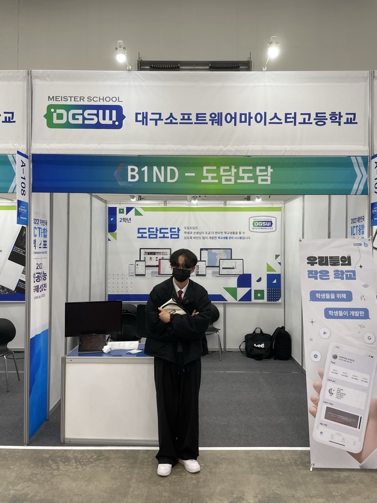 2022년 11월 9~11일(3일간) 진행되었다. 우리 바인드 팀은 '도담도담 V6'로 출품하게 되었는데, 기존 도담도담의 장점에 대한 설명(종이 장부를 대신하는 페이퍼리스 학생 생활 관리 시스템)보다 버전 6에서 바뀐 점들 및 앞으로의 방향성을 브리핑하는 방향으로 부스 설명을 계획했다. 중간중간에 식사 시간도 있고 휴식 시간도 있어야 하기에, 로테이션을 돌며 한 명당 1시간 꼴로 부스를 지켰다. 외부인 및 기업 대표 분들, 교육인 분들도 많이 방문해 주셨다. 강은희 대구교육감님이 방문하시는 날도 있었는데, 상은이와 함께 팀을 대표해 사진을 찍었다.