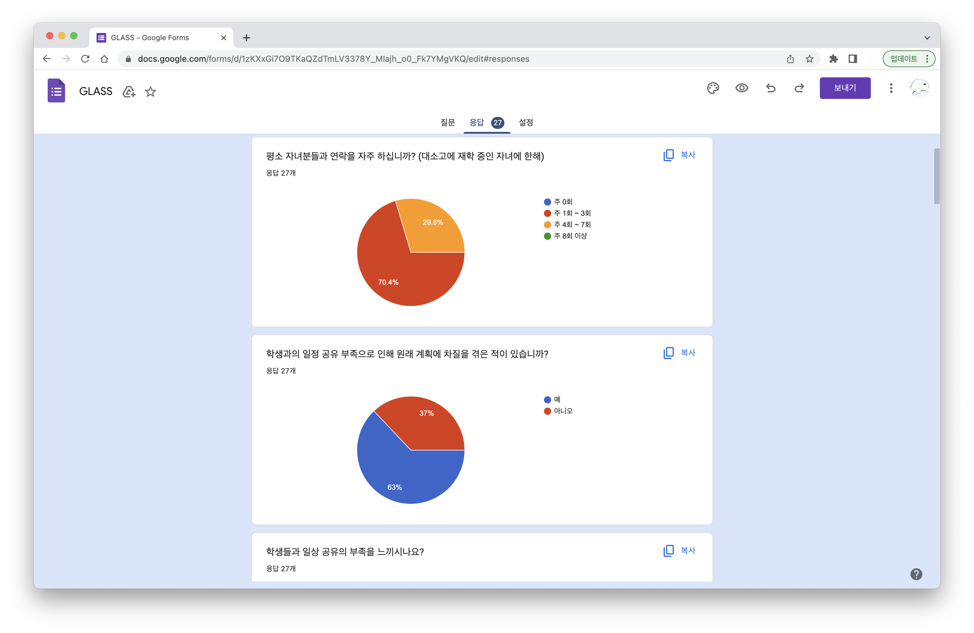 실제 학부모 및 학생 27명에게 설문 조사를 진행하여 서비스에 대한 니즈를 파악했고, 서비스 소개 자료에도 첨부했다.