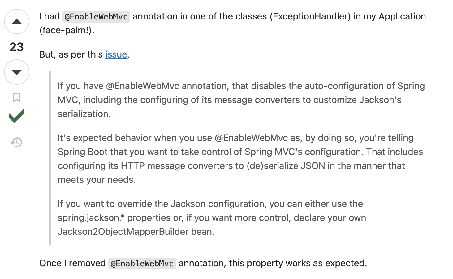 요약하자면, 자신의 백엔드에서 @EnableWebMvc 어노테이션을 쓸 경우에 application.properties의 전역 설정이 덮어쓰기 되어 먹히지 않는다는 것이다.