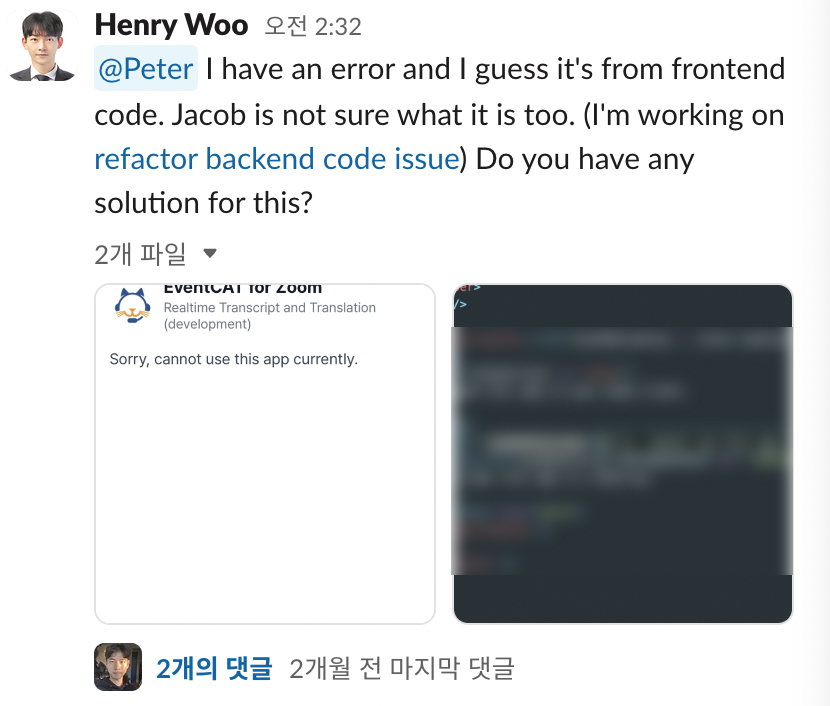 위에서 언급했듯, 필자는 XL8사에서 백엔드 개발을 하게 되었다. XL8사에 뽑힌 인턴 학생은 나 뿐만이 아니라 배진영(Jacob) 동기도 있었는데, 이 친구는 프론트엔드 개발을 하여 같은 프로젝트를 진행하게 되었다. XL8은 구어체 기반 기계번역 개발 회사인데, 여기서 우리는 Zoom 회의 내에서 번역을 해주는 서드파티 앱(EventCAT)을 개발/유지보수했다. 해당 서비스는 Nuxt로 이루어져 있었기에, Nuxt3 Server Engine Nitro(Node.js) 및 TypeScript 스택을 사용하여 개발했다. 구체적인 개발 내용은 기밀일 수 있기에 세세히 명세하진 못한다.