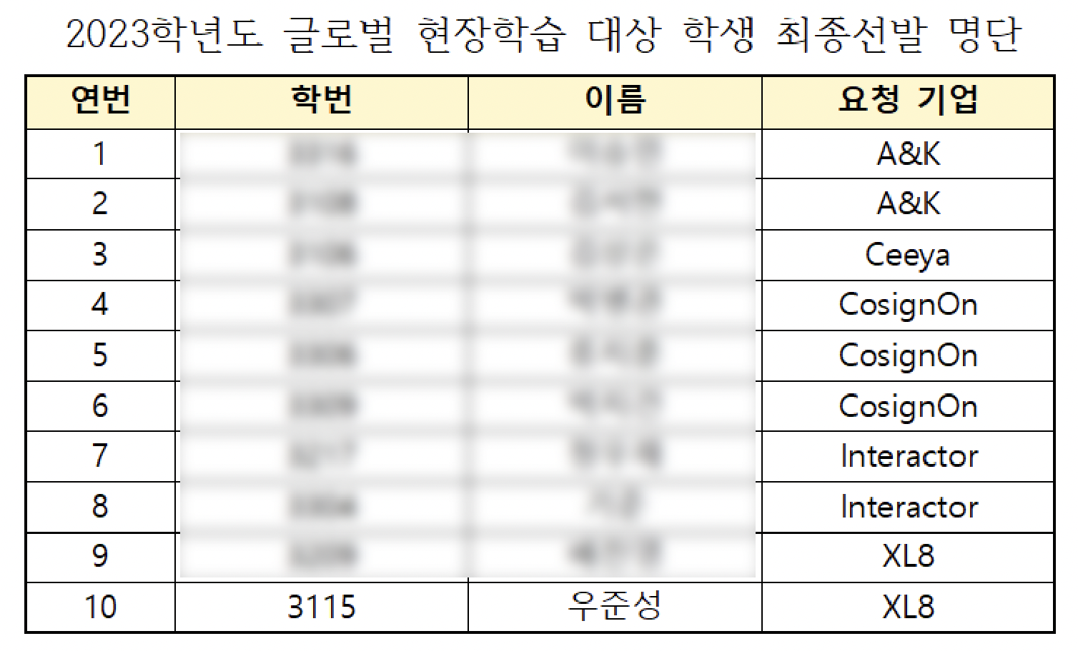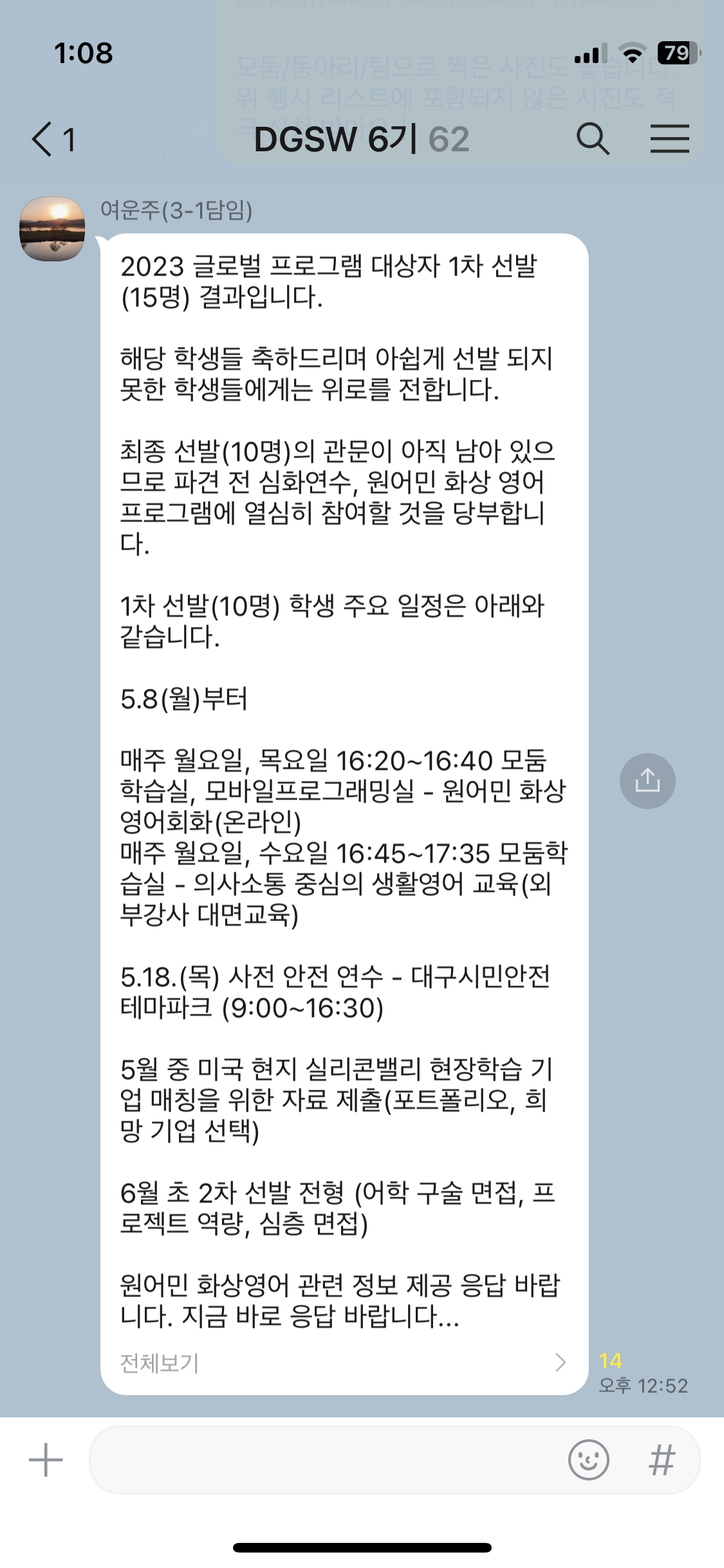위의 서류들을 제출하고 기다린 결과, 다행히 15명 안에 들어올 수 있었다. 필자의 형제가 총 3명이기에 사회 배려 대상자에도 해당되어, 일반 전형보다 더 높은 확률로 뽑힐 수 있었다. 아래 사진처럼 글로벌 연수 준비를 위한 여러 교육이 진행되었고, 2차 선발 또한 진행되었다. 필자의 경우 원어민 선생님과 함께 진행하는 어학 구술 면접에서는 미리 대본을 작성했다. 실리콘밸리에 가고 싶은 이유 등에 대한 연설을 혼자 진행한 후 질의응답을 하는 방식이었다. 면접 당일 굉장히 떨렸지만, 평소 영어 프리토킹 능력을 쌓은 덕에 질의응답에도 잘 대응할 수 있었다.