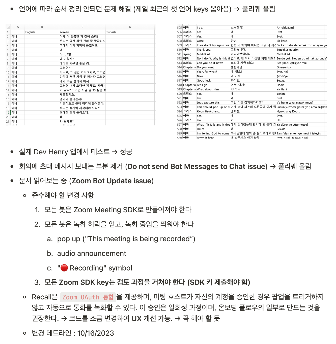 프로젝트를 진행하며 현재 진행 상황에 대해 정확히 파악하고 보고하기 위해 (그리고 추후 회고 등을 기록하기 위해) 노션에 개인적으로 업무 일지를 작성했다. 아래 왼쪽 사진처럼 오늘 했던 일을 작성하고, 해결해야 할 문제를 적었다. 아래 오른쪽 사진은 외부 회사인 Recall.ai와 컨택하는 메시지인데, 이것 또한 신기한 경험이었어서 그냥 사진으로 넣었다.