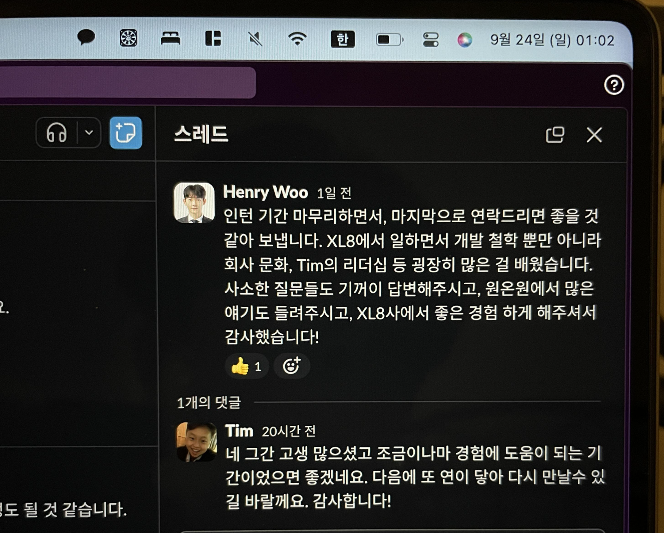 세번째는 팀 내 업무 공유의 중요성이다. XL8은 원격 근무가 많고 직원들이 서로 다른 나라에서 일하고 있기에 소통이 훨씬 중요한 회사였기에, 그만큼 회의를 자주 진행하고 슬랙 협업툴을 적극적으로 사용했다. 프로덕트에 대한 의견과 문제들은 슬랙에서 실시간으로 논의되었고, 다른 팀원들이 볼 수 있도록 (각 부서의 진행 상황을 공유할 수 있도록) 사소한 문제도 DM보다는 채널에서 소통이 진행되었다. 학교에서 팀 프로젝트를 진행할 때에도 업무 공유의 부재를 굉장히 많이 느꼈었는데, 이 회사에서 일하며 해결할 방법을 찾은 느낌이었다. (여담으로, 사수님이 가르쳐주신 것들 중 '보고 관련 미팅 시 배경 설명을 최대한 많이 하면 좋다'라는 것이 있었다. 상대가 알고 있는 배경이라도 기꺼이 설명하면서, 어떤 것이 문제고 어떤 방향으로 해결해야 할지를 더 빨리 파악할 수 있게 도와야 한다고 하셨다.)