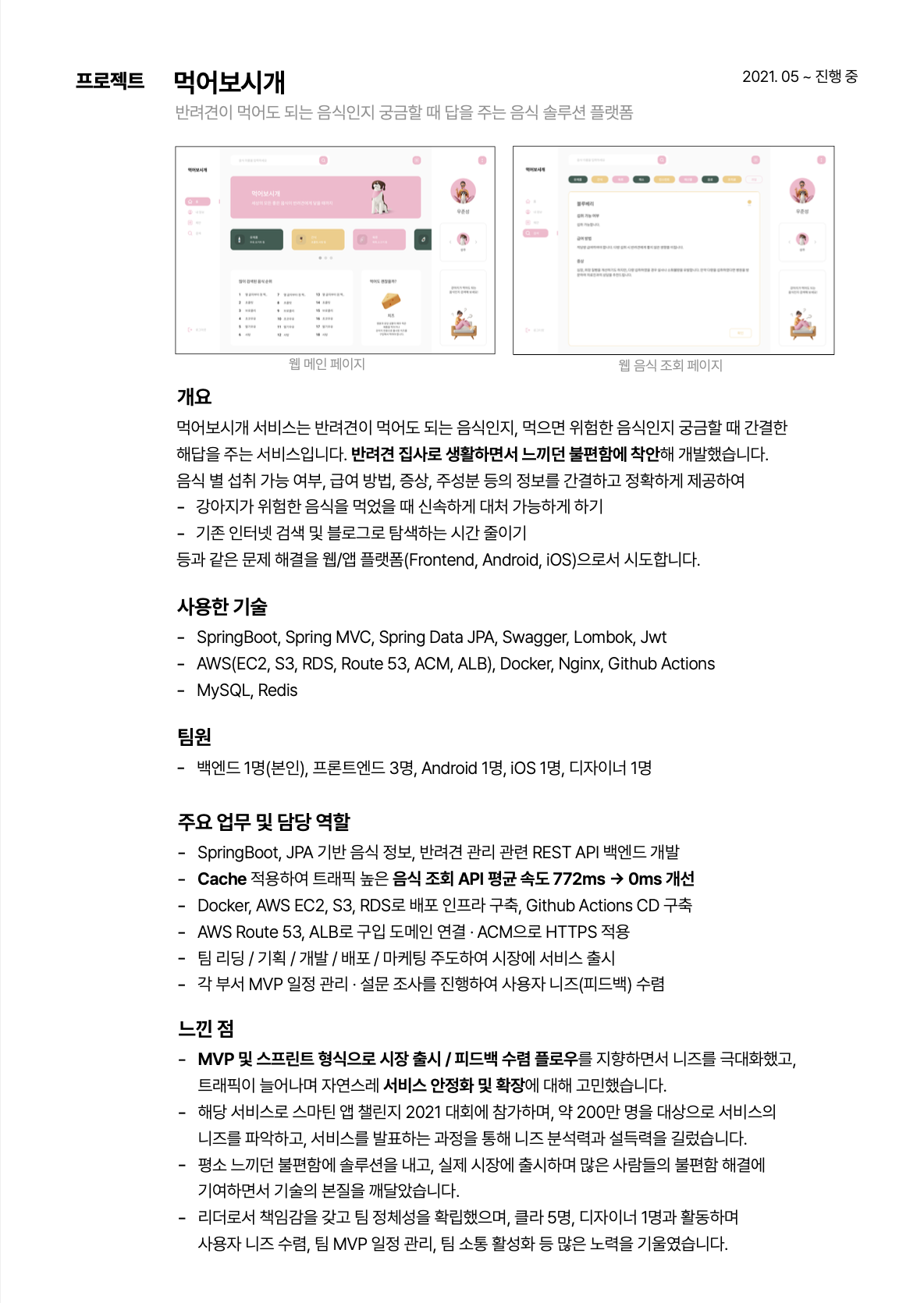 - 반려견 생명 존중 서비스, 먹어보시개 백엔드 개발 및 팀 리딩 (대회 참가 프로젝트) (2021.05~진행중)