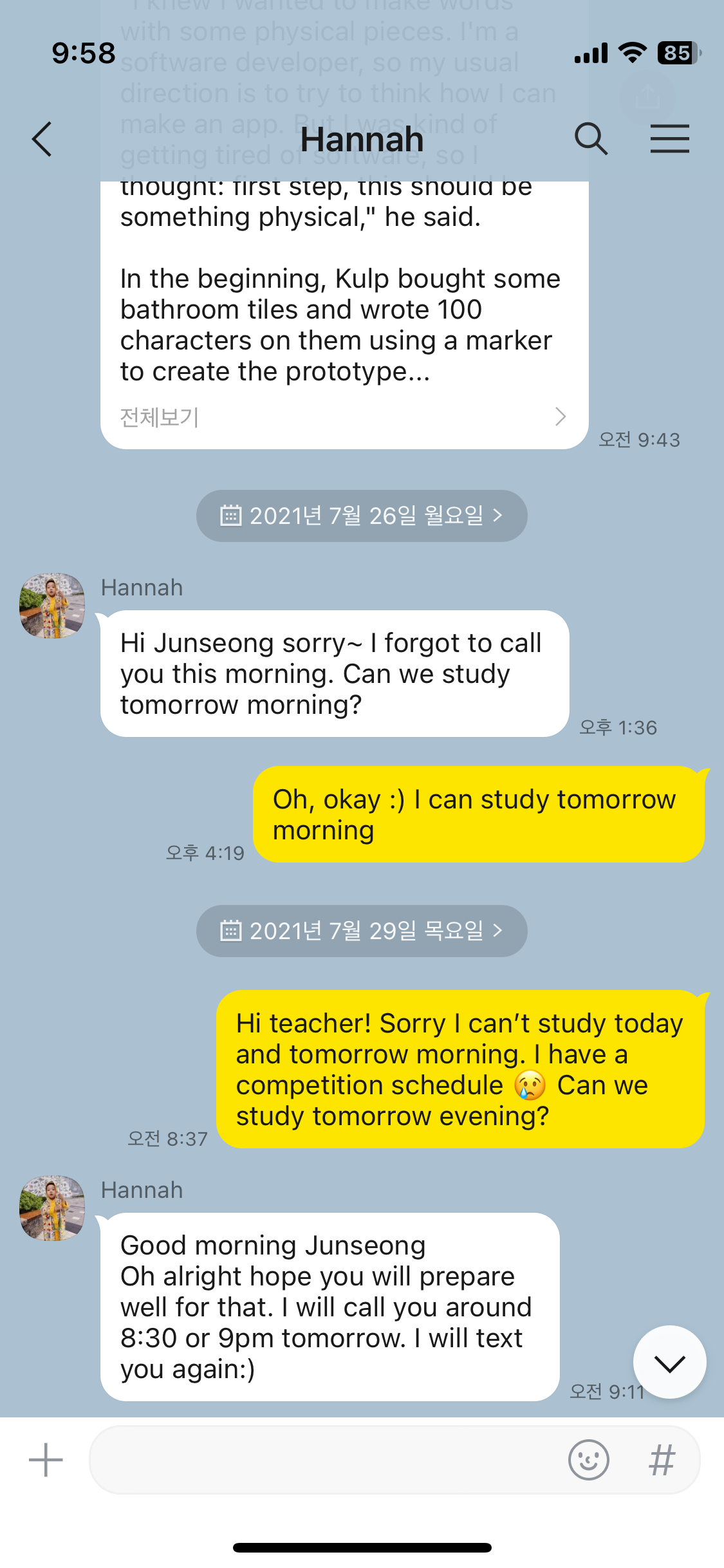 1학년 때는 아쉽게 학교에서 진행하는 화상영어 프로그램에 선발되지 못해서 사비로 전화영어를 진행했고, 2학년부터는 화상영어 프로그램에 선발되어 학교 지원을 받아 학습을 했다. 현지에서 직접 부딪히며 배우는 영어가 제일 도움 되었지만, 그 차선책으로는 화상영어가 제일 도움이 된다고 느꼈다.