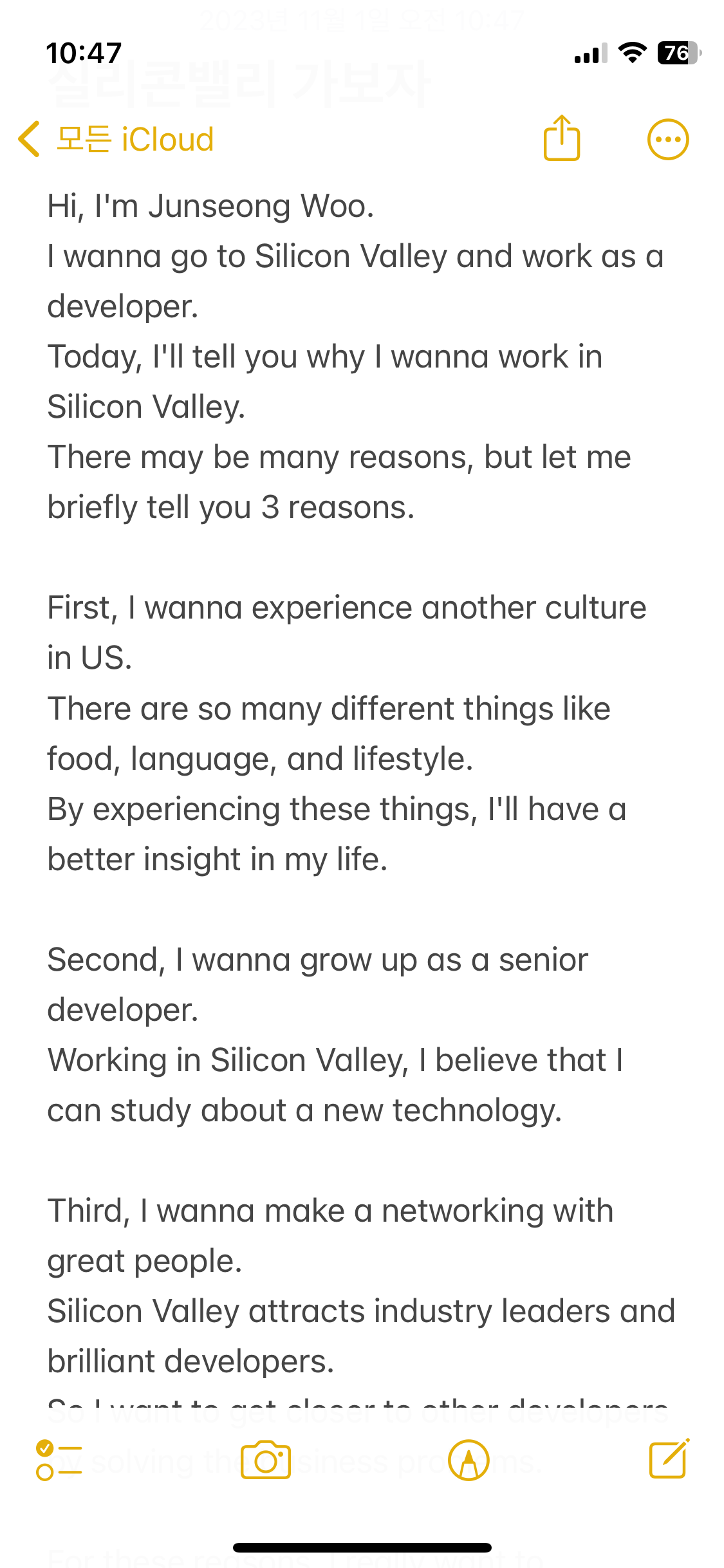 또한 출퇴근 시간을 쪼개어 책이나 오디오 북으로 현지 영어 표현을 공부하고, 직장에서 원활한 커뮤니케이션을 위해 노력하여, 실리콘밸리에 개발자로 정착하기 위한 기반을 마련할 것입니다. 이러한 노력을 다하여 인턴 과정을 거쳐 정직원으로 채용된다면, 병역 문제 해결 및 영주권 획득을 위해 회사 측과 소통하며 해결 방법을 찾겠습니다. 쉽지 않은 길인 만큼 그동안의 노력과 절실함을 되새기며 ‘실리콘밸리 개발자’의 꿈을 이루겠습니다.