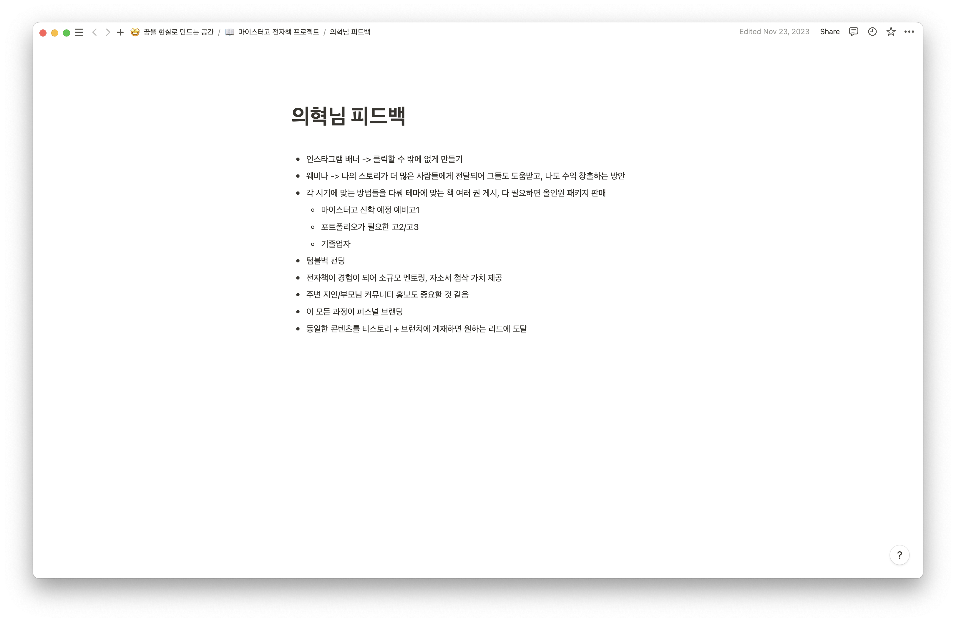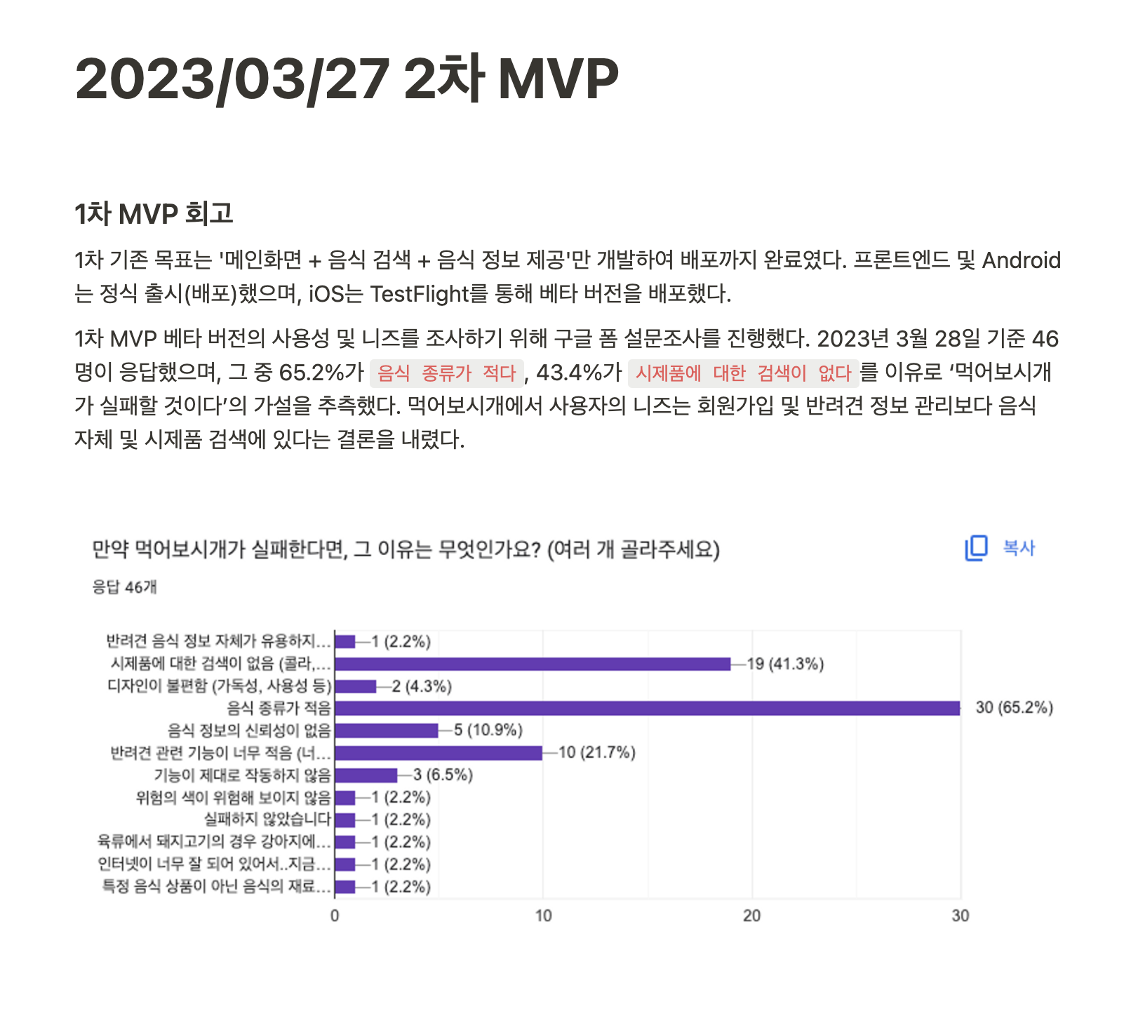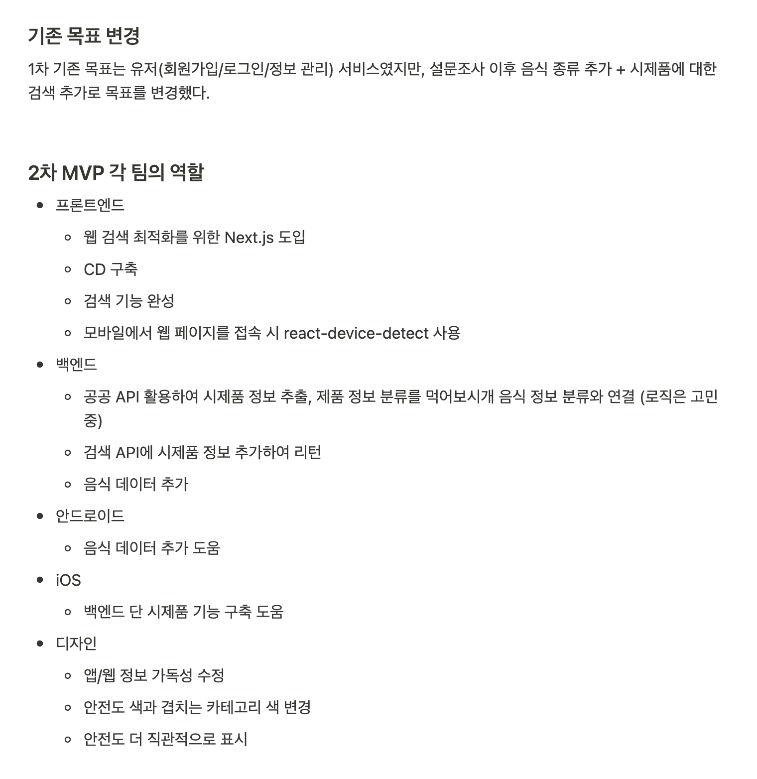 위 사진처럼 앱/웹 홍보 및 설문조사를 진행했고, 아래 사진처럼 노션에 1차 MVP 회고 및 2차 MVP 계획을 세웠다. 2차 MVP를 진행하는 과정에서 팀원들의 취준 일정 때문에 개발이 잠정 중단되었다.