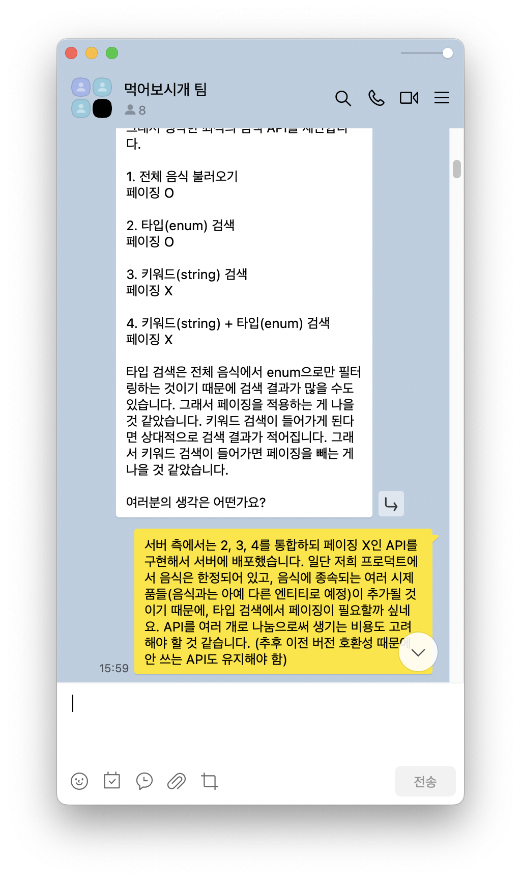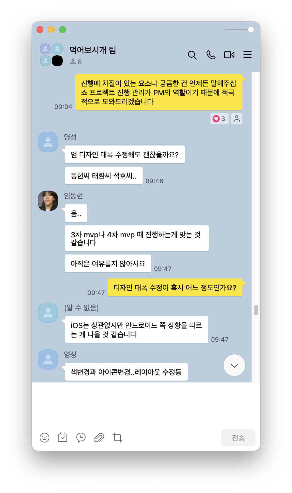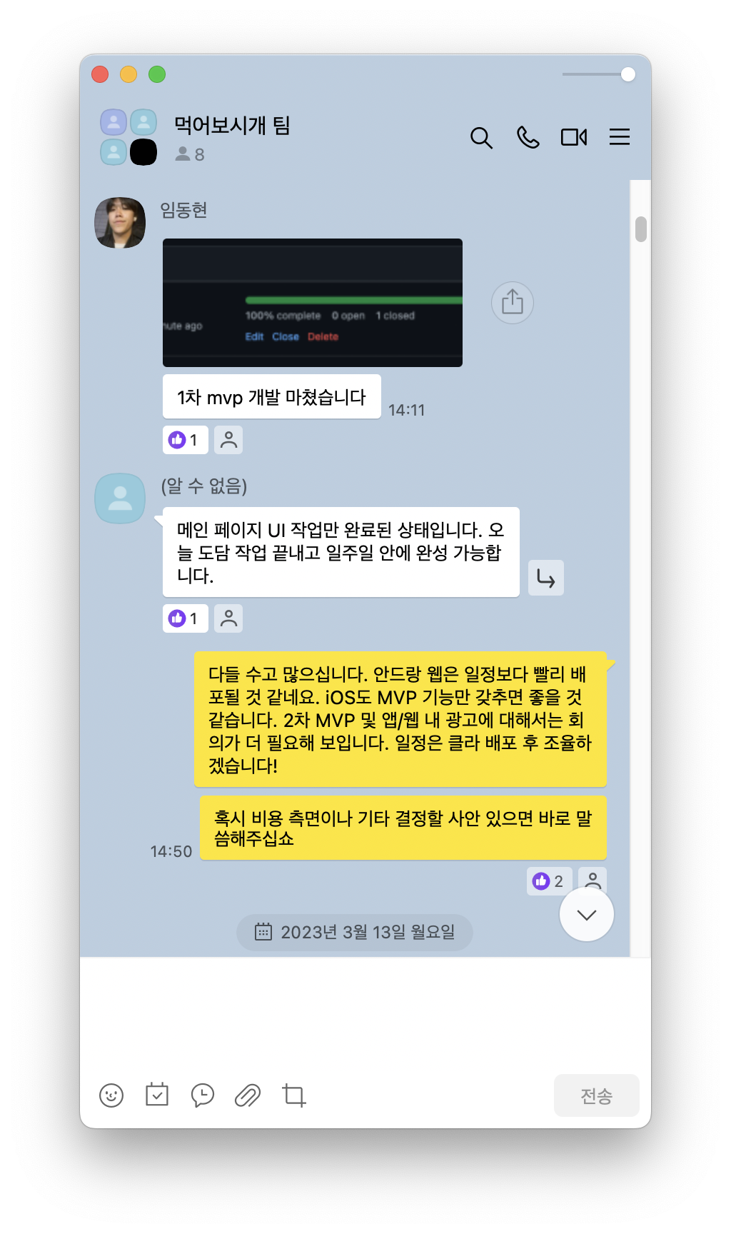 실제로 회의를 진행한 사진은 없지만, 2023년 상반기에 팀원들과 온/오프라인으로 꽤 많은 대화를 나눴다. 아래 사진에 수많은 대화 중 일부를 가져왔는데, 다들 능동적으로 역할을 소화하고, 다른 팀원들과 소통하려 해 줘서 고마웠다. 특히 프론트엔드 개발자 임동현, 안드로이드 앱 개발자 김태환, iOS 앱 개발자 이석호, UI/UX 디자이너 김영성이 각 개발 분야에서 리드해 줬기에 꽤 멋진 서비스가 세상에 나올 수 있었다.