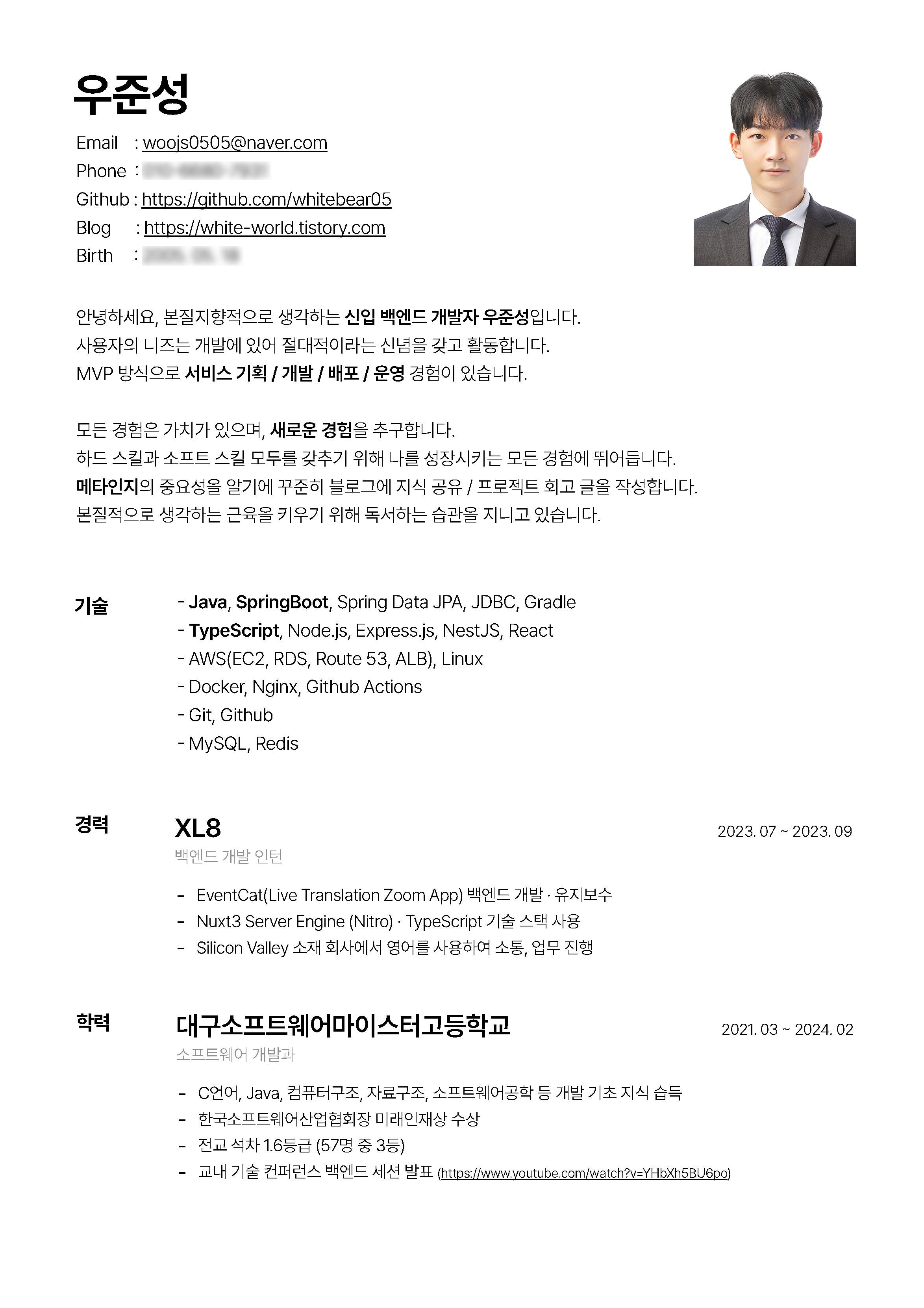 결과적으로는 꽤 좋은 포트폴리오 산출에 성공했다. 어쩌면 이 포트폴리오 덕에 판교의 스타트업 및 신한은행 ICT 전형에 최종 합격했고, 이후에 실리콘밸리 인턴 경력 및 추가적인 수상/자격증들을 추가하며 더 좋은 포트폴리오가 되었다. 혹시 취업을 준비하고 있다면, 열정이 있는 다른 분들과 같이 취업에 대한 목표를 세우고 피드백을 주고받는 것을 적극 추천한다. (아래에 포트폴리오(이력서)의 일부분을 첨부했다.)