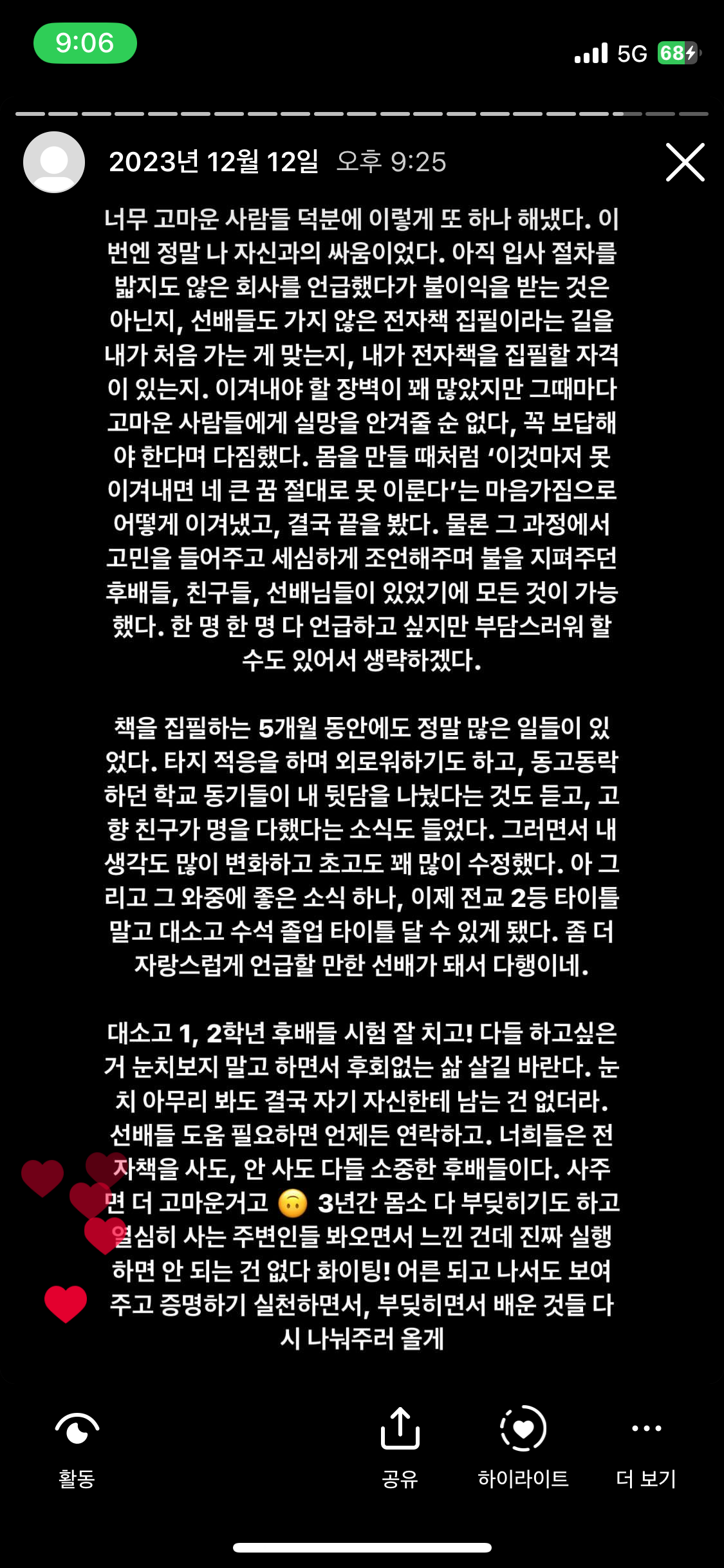 원래 미리 작성해서 2023년 12월 31일에 업로드하려 했지만, 연말에 신한 연수때문에 갑자기 바빠지는 바람에 1월 중순이 되어서야 틈틈이 작성했다. '이 사람은 2023년을 이렇게 살아왔구나'하며 부담 없이 끝까지 읽어주시면 너무나 감사하겠다.