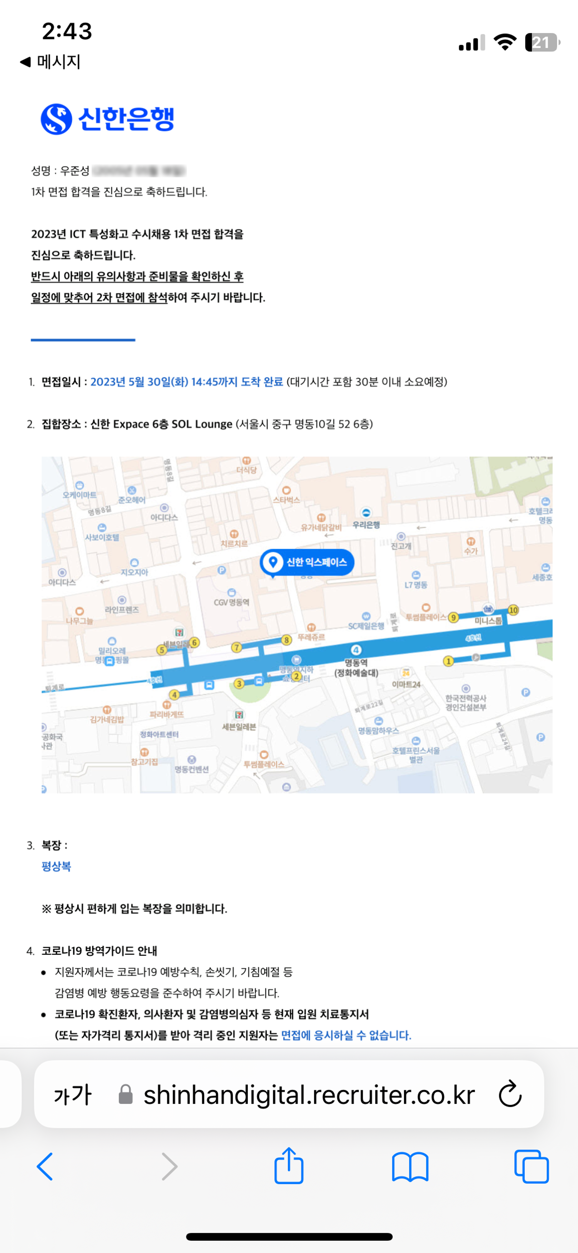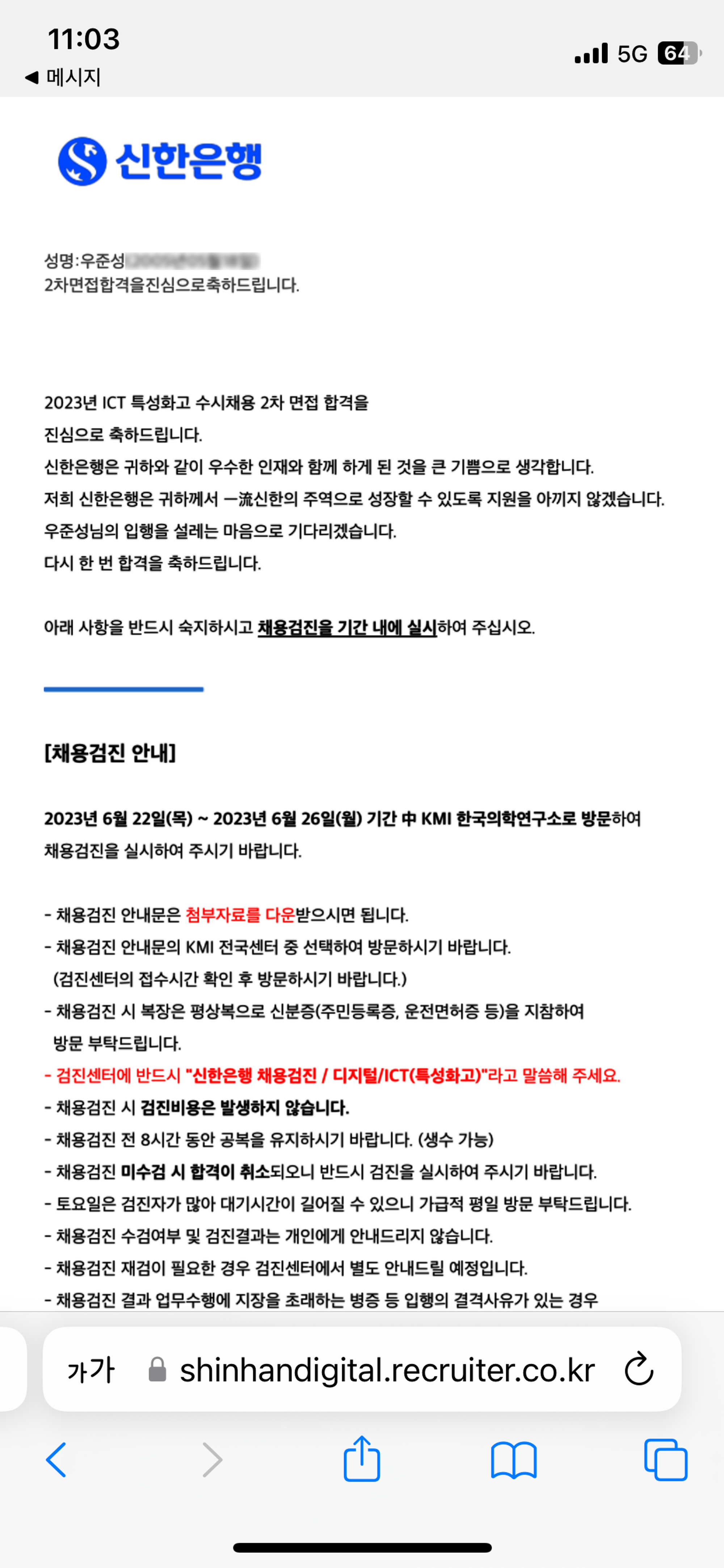 필자 같은 경우는, 2023년 초반부터 이력서를 돌리기 시작하여 100여 번이 넘는 불합격의 고배를 마셨다. 고졸 개발자 및 미필이라는 허들과 IT 취업시장 불황이 겹쳐서 취업은 쉽지 않았다. 그럼에도 적극적으로 구직 활동을 한 결과, 두 곳에서 합격 소식이 들려왔다. 첫 번째는 판교의 스타트업 '오후두시랩'이었고, 두 번째는 '신한은행'이었다. 아래에 오후두시랩의 '인턴 제안서' 일부와 신한은행의 합격 조회 사이트 캡쳐본을 첨부했다.