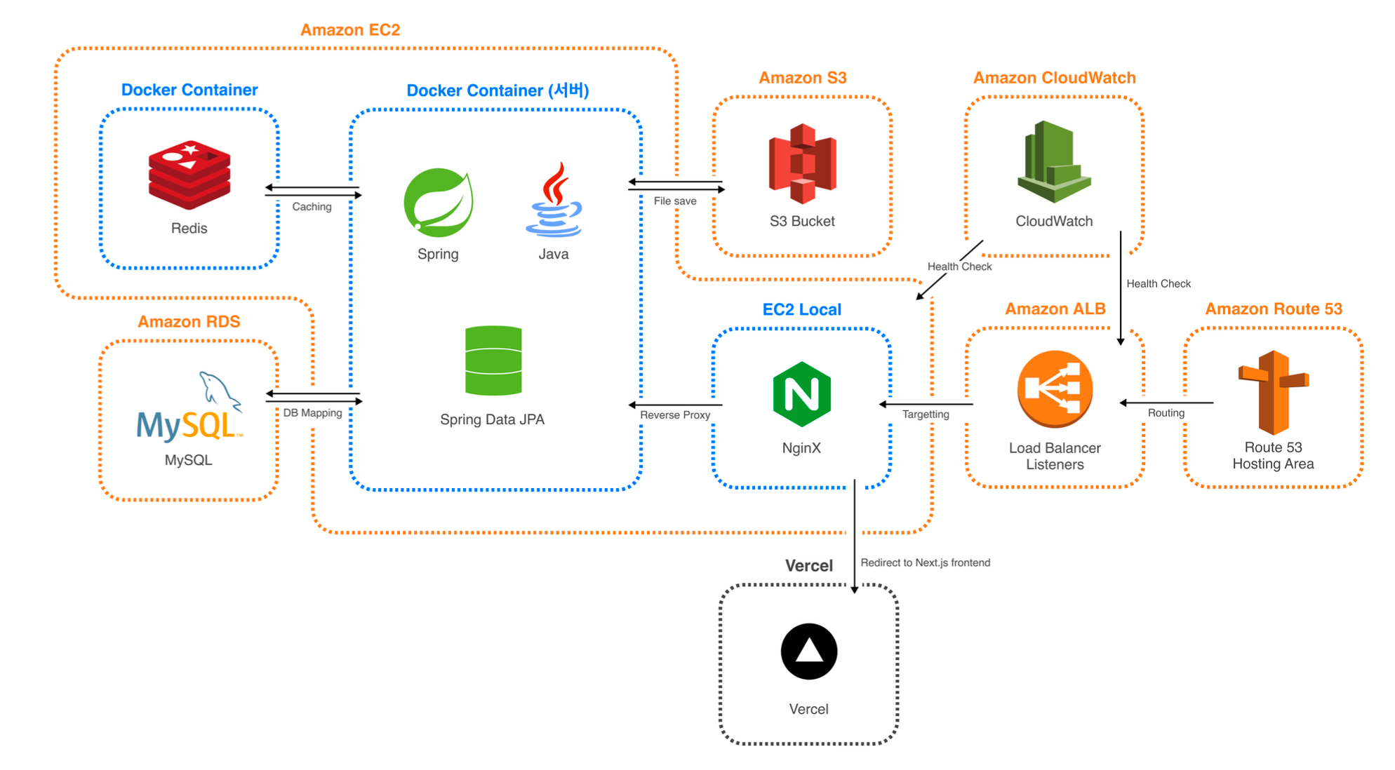 결과적으로 올해에는 웹, 플레이스토어, 앱스토어에 1차 MVP를 배포해 초반 사용자들의 피드백을 얻는 것까지 진행했다. 필자는 팀장과 백엔드 개발자 두 역할을 맡았다. 팀장으로서 팀을 구성하고 방향을 잡아 이끌었고, 백엔드 개발자로서 SpringBoot 서버를 개발하고 AWS를 적극 사용해 인프라를 구성했다. 해당 링크에 깃헙 레포지토리를 남겨 놓았다. 인프라 구성은 아래 사진에 넣었으니 참고해주면 좋겠다.