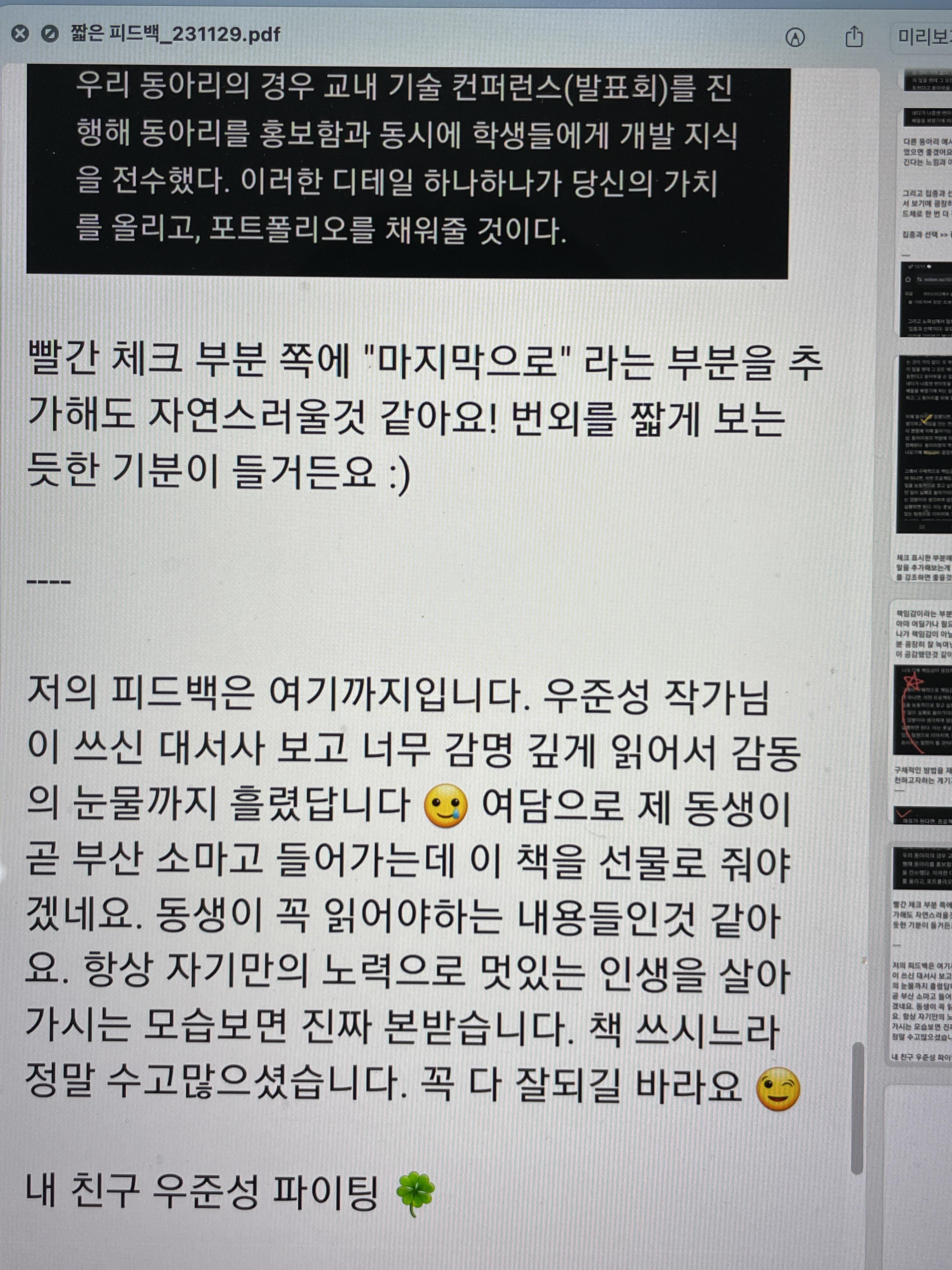 이 과정을 성공적으로 마무리한 것은 바쁜 와중에 '전자책 출간'이라는 목표를 세우고 끝까지 밀고 나간 내 노력도 있지만, 주변 사람들의 도움이 없었으면 이 책은 세상에 나오지 않았을 것이다. 전자책에 관한 아이디어를 막 떠올렸을 때 구체적인 전자책 관련 정보를 주신 박의혁 앙트너님, 포기하고 싶을 때 끊임없이 열정을 심어준 김민성 동기, 적극적이고 예리한 피드백을 주고 책 표지를 같이 고민해 준 전아현 선배, 휴식이 필요할 때 같이 산책하며 책의 단가, 수요, 내용 등에 대해 기꺼이 피드백을 해준 임재청 동기, 바쁜 와중에 전자책 표지 디자인을 트렌디하게 뽑아준 김영성 동기, 책 내지 디자인과 구매 상세페이지 디자인을 전적으로 도와준 정은서 동기, 초반 목차 구성과 본문 피드백에서 도움을 준 이지민 후배, 깊고 알찬 피드백을 준 심미진 동기, 그리고 차마 언급하지 못한 곁에서 응원해 준 선배들, 동기들, 후배들, 지인들 모두 진심으로 감사한다. 언젠가 꼭 크게 보답해야 한다!