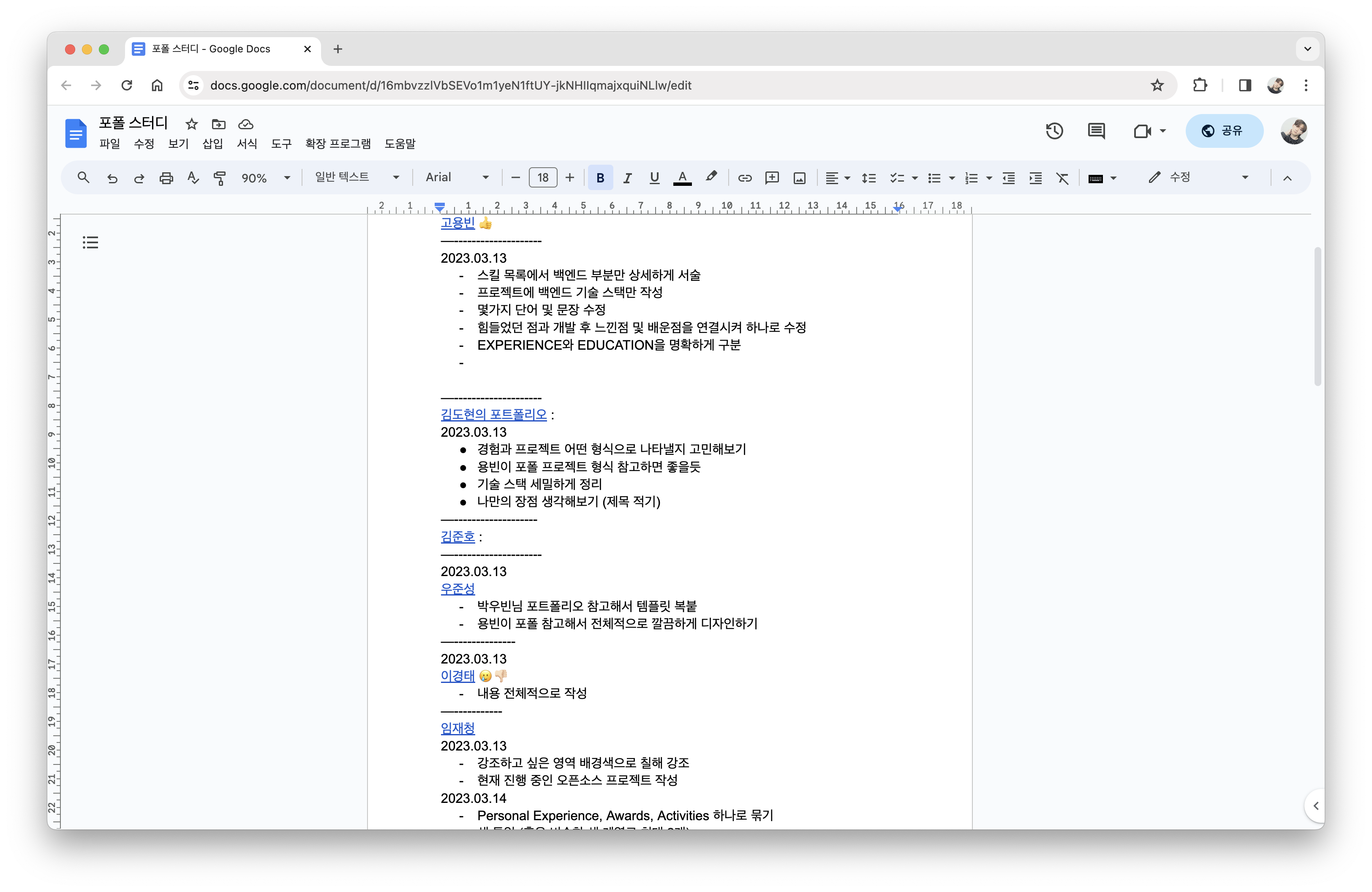 마이스터고 3학년은 적극적으로 취업 시장에 뛰어들 시기기에, 본격적으로 포트폴리오를 작성하기 시작했다. 주변의 같이 취업을 준비하는 친구들을 모아 서로 피드백을 주고받으며, 정기적으로 모여 포트폴리오를 차츰 쌓아가는 습관을 만들면 좋을 것 같다 생각하여, 이른바 '포트폴리오 스터디'를 만들었다. 그 직후에는 항상 좋은 결과물을 만들기 위해서는 좋은 레퍼런스를 참고하는 것이 중요하다고 생각해서 레퍼런스부터 탐색하기 시작했다. 유튜브 '개발바닥'에서 추천한 백엔드 개발자 박우빈 님의 포트폴리오를 최종 레퍼런스로 결정하고, 서로 활동한 경력을 기반으로 포폴을 작성하고 정기적으로 모여 피드백을 주고받았다.