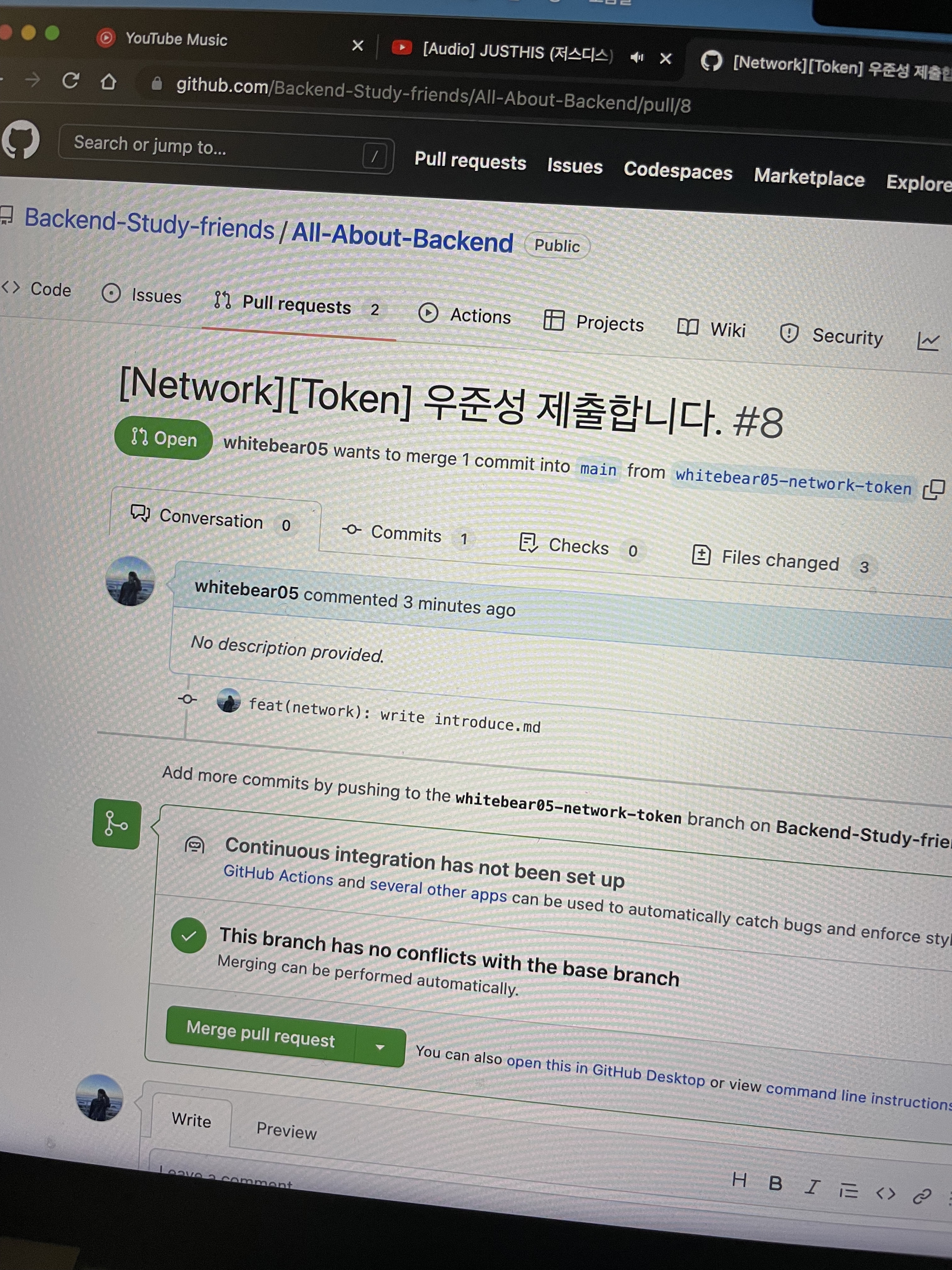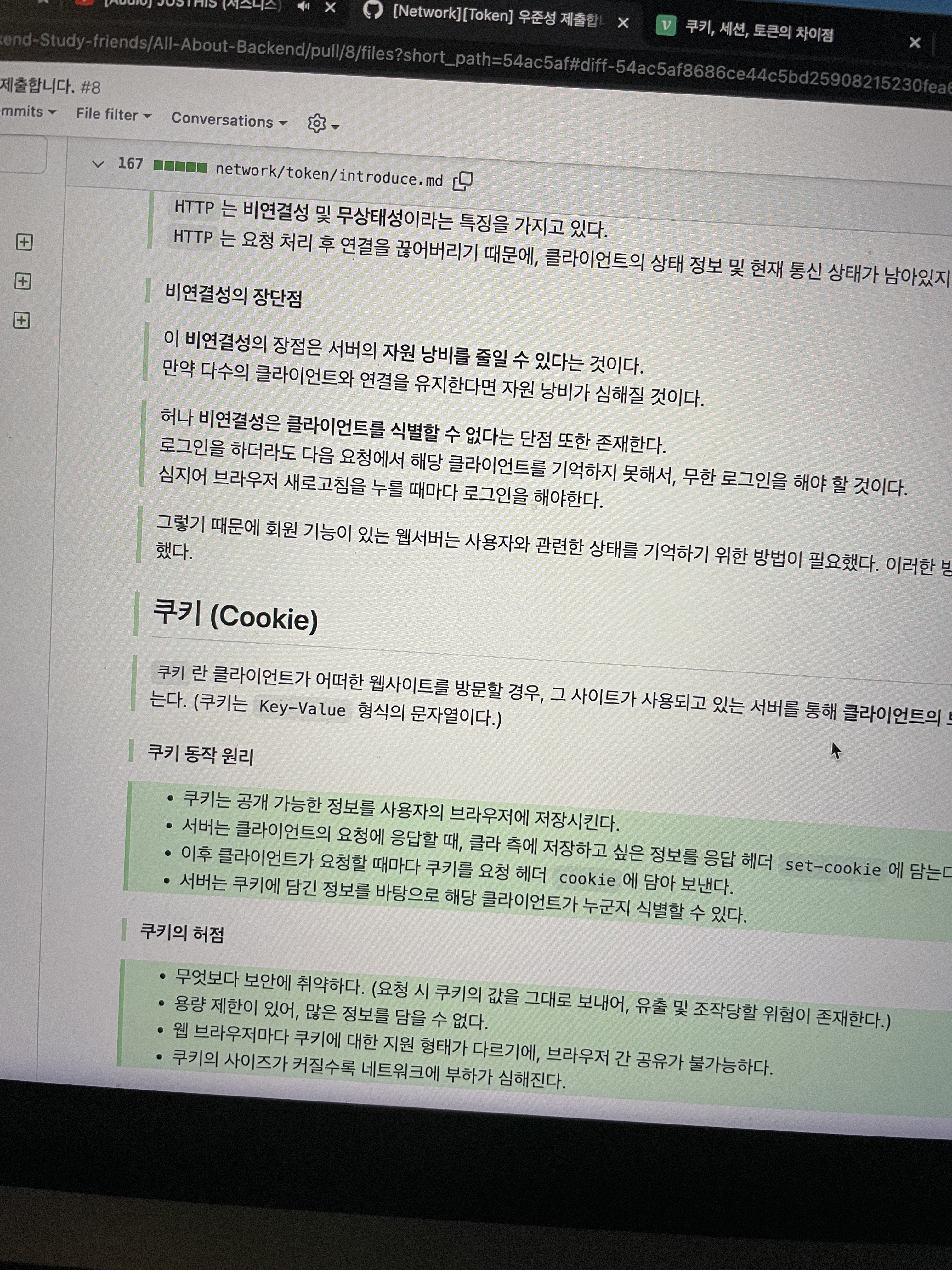 백엔드를 통달하기에는 굉장히 짧은 스터디였지만, 주변의 실력 좋은 친구들로부터 지식도 배우고 열정도 전수받을 수 있었던 소중한 시간이었다. 여담으로, 이때 같이 스터디를 진행했던 원용이란 친구가 우테코를 거쳐 토스에 최종 합격했다는 소식을 전해줬다. 옆에서 꾸준히 노력하는 것을 봐왔던 나로서 굉장한 동기부여를 받았다! (레포지토리가 행방불명이 되어, 아래 사진으로 대체한다 ㅠㅠ 스터디를 진행하며 내가 작성했던 몇몇 자료들은 블로그에도 기록해 놨었다. HTTPS와 SSL에 관한 글, HTTP 쿠키 세션 토큰에 관한 글)