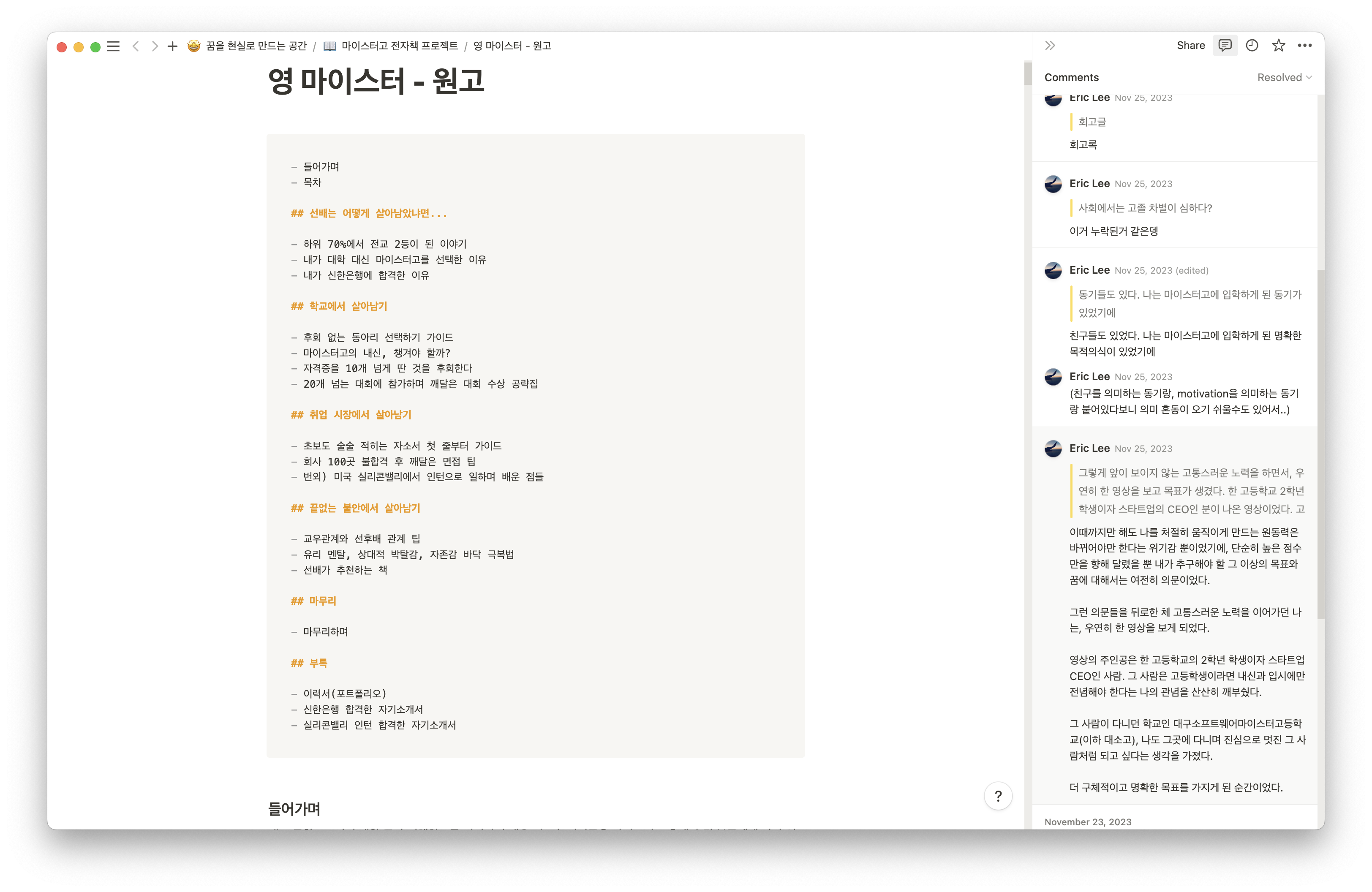 경제 및 재정적 자유에 관한 책을 여러 권 읽으면서, 항상 언급되었던 부수입 창출 방법 중 하나는 '전자책'이었다. 꼭 수입뿐만이 아니더라도 자서전 같은 글을 통해 자기 PR을 하고 싶었기에 (고등학교를 떠나기 전에 내 흔적을 남기고 싶었기에), 언젠가 하고 싶은 버킷리스트였다. 책의 목차를 세우고 바쁜 와중에도 틈틈이 원고를 작성했다. 프로젝트, 구직 활동, 실리콘밸리 인턴 등의 일정이 쉴 틈 없이 몰아쳤기에 진척은 조금 느렸지만, 2023년 12월 12일 드디어 출간하며 약 5개월의 결실을 맺었다. 현재는 크몽(https://kmong.com/gig/529706)에서 판매하고 있다. 책에 대한 상세 설명은 위 크몽 링크의 상세페이지에 있으니, 참고해 주면 감사하겠다.